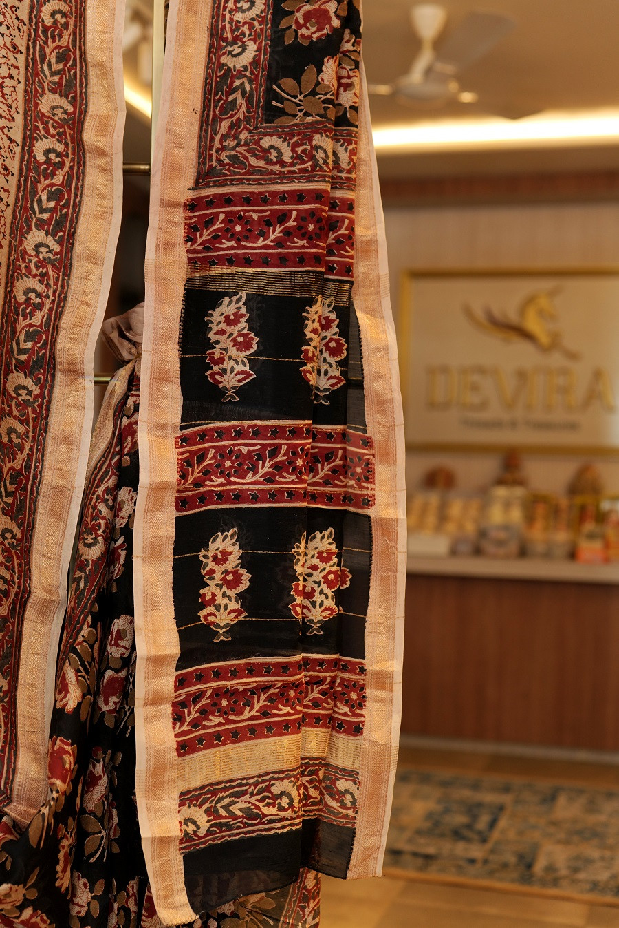 Step into timeless elegance with Rangrez Raat, an authentic Bagru hand block print saree inspired by the mystical beauty of Rajasthani nights. Draped in a deep charcoal-black base, this masterpiece is adorned with delicate floral creepers in earthy rust and maroon hues. The contrasting beige-red traditional border frames the saree with regal charm, while the richly detailed pallu reflects the finesse of heritage Bagru craftsmanship.