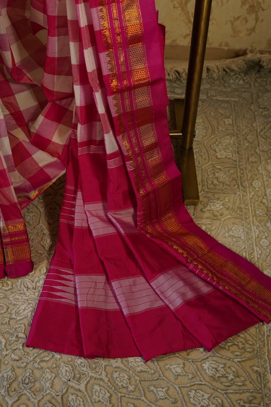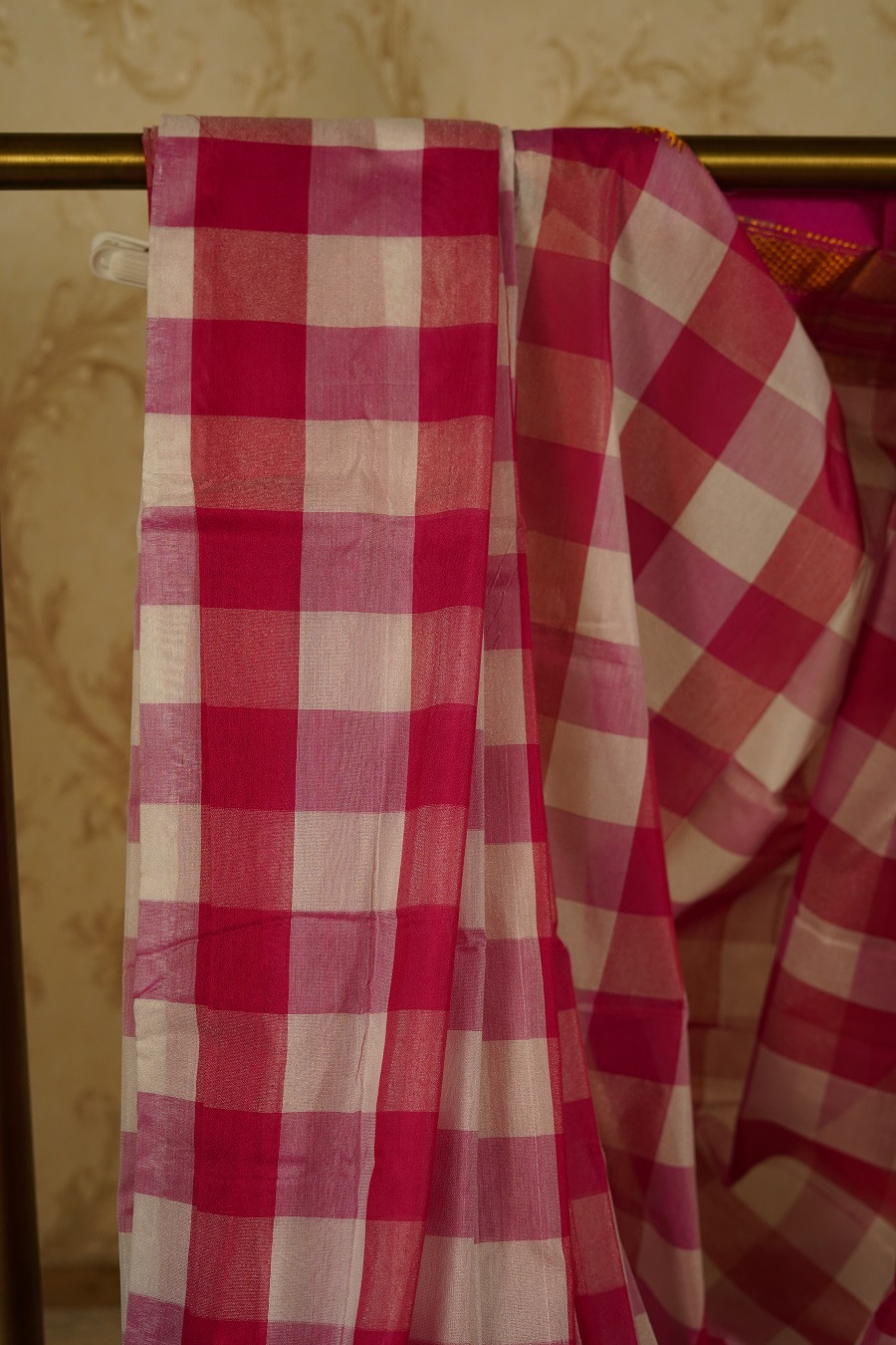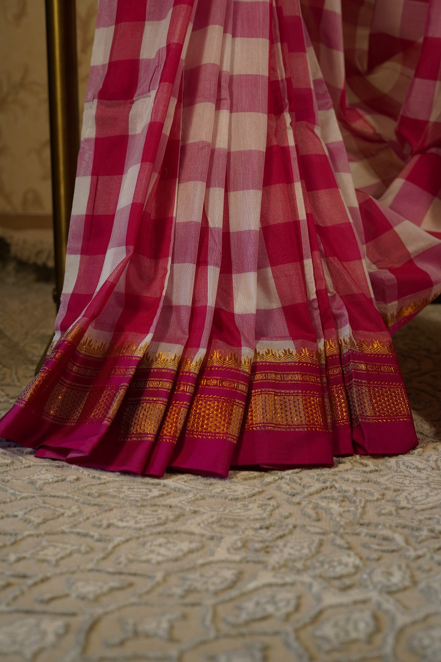 Woven in a soft cotton silk blend, the saree features a striking rani pink and ivory checkered body — rhythmic, refined, and rich in visual character. The vivid pink border and pallu are elevated with intricate zari detailing and signature temple-inspired motifs, lending ceremonial brilliance to the structured checks.