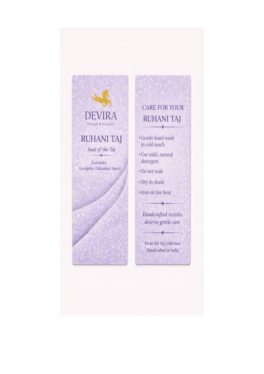 Ethereal and profoundly graceful, The Ruhani Taj is a meditation in elegance—where softness, spirituality, and imperial craft converge. Rendered in a tranquil lavender hue, the saree carries a soulful calm, reminiscent of dawn light settling over marble domes and silent palace courtyards.