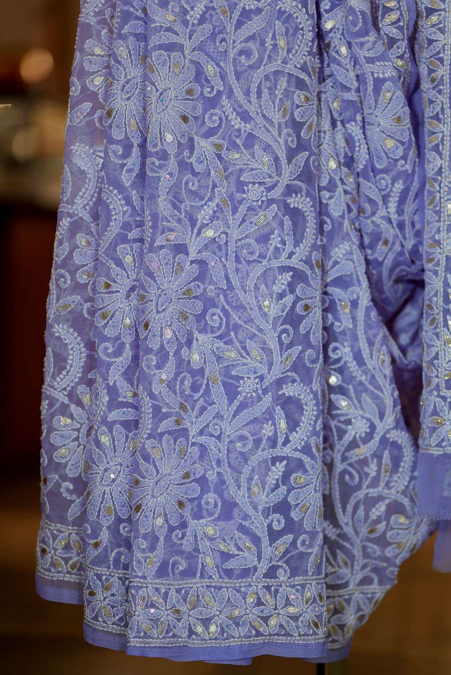 Crafted in pure georgette, the fabric is feather-light and fluid, offering an effortless, airy drape. The surface is adorned with meticulously hand-embroidered Lucknowi Chikankari, unfolding in refined floral jaals and flowing vine motifs. Select elements are delicately enhanced with gota patti, introducing a restrained, luminous shimmer that feels gentle and refined rather than ornate.