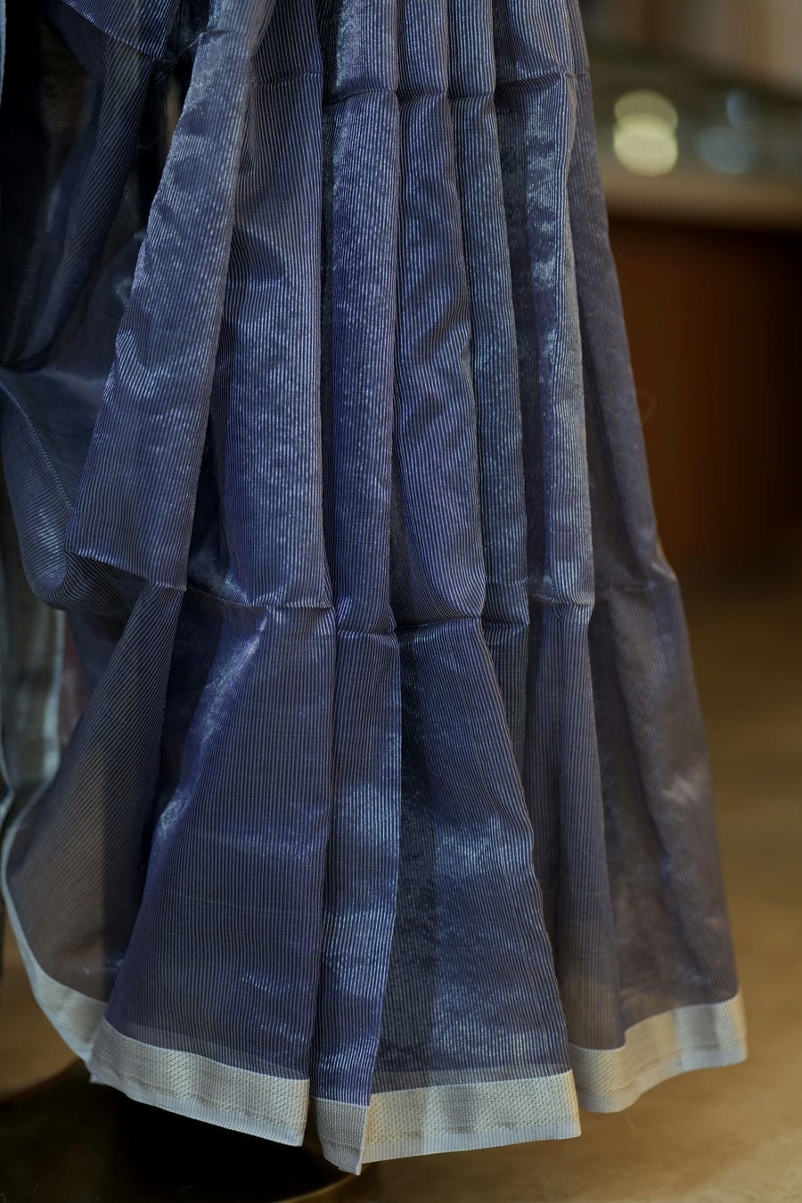 The saree comes paired with a coordinated sapphire blue blouse featuring delicate silver stripes - adding a refined contrast and completing the look with subtle sophistication.