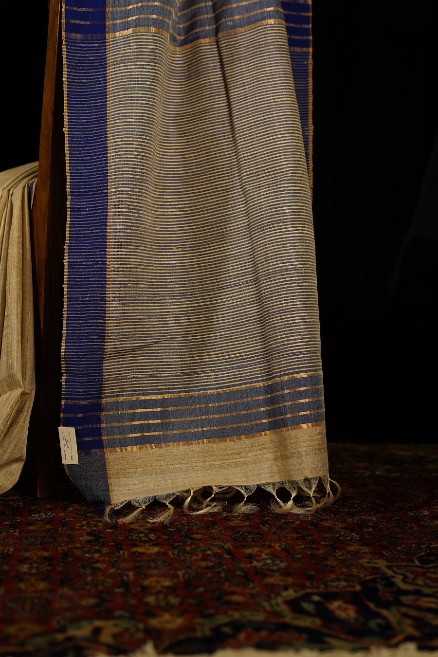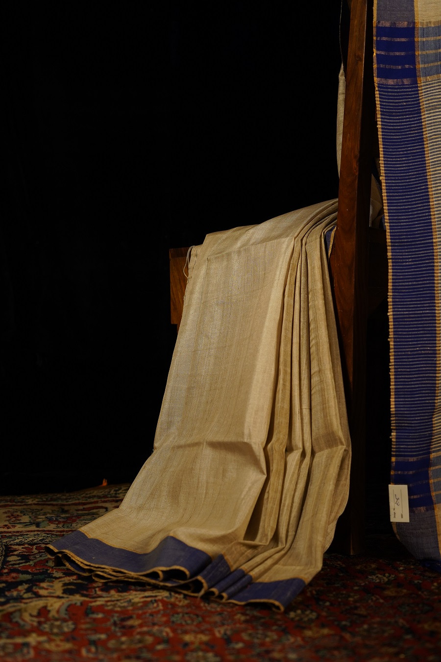 Flowing with quiet grace, The Sarita Kosa is woven in pure Tussar (Kosa) Silk, celebrated for its natural texture and understated sheen. The warm beige body forms a serene canvas, gently defined by deep blue woven borders that echo the calm rhythm of flowing water.