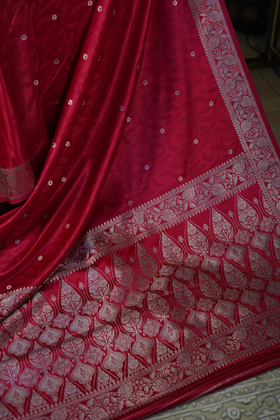 Bold, radiant, and deeply rooted in heritage, The Scarlet Sovereign is crafted in luxurious Mashru semi silk—a fabric celebrated for its smooth silk-like sheen and comfortable cotton-blend feel. Drenched in a rich scarlet red, this saree embodies festive grandeur with effortless grace.