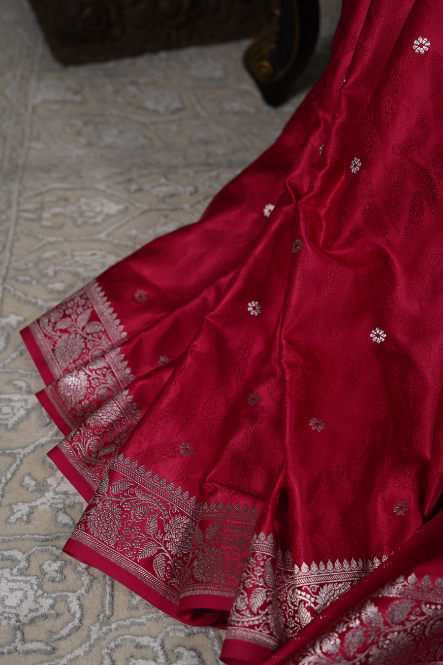 Lightweight yet regal, the drape flows beautifully, offering both structure and comfort. Perfect for weddings, festive gatherings, pujas, and special occasions, The Scarlet Sovereign pairs elegantly with temple jewellery, gold bangles, or classic pearls for a look that is vibrant and refined.
