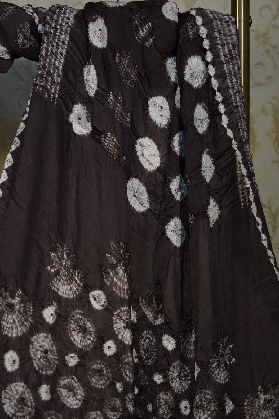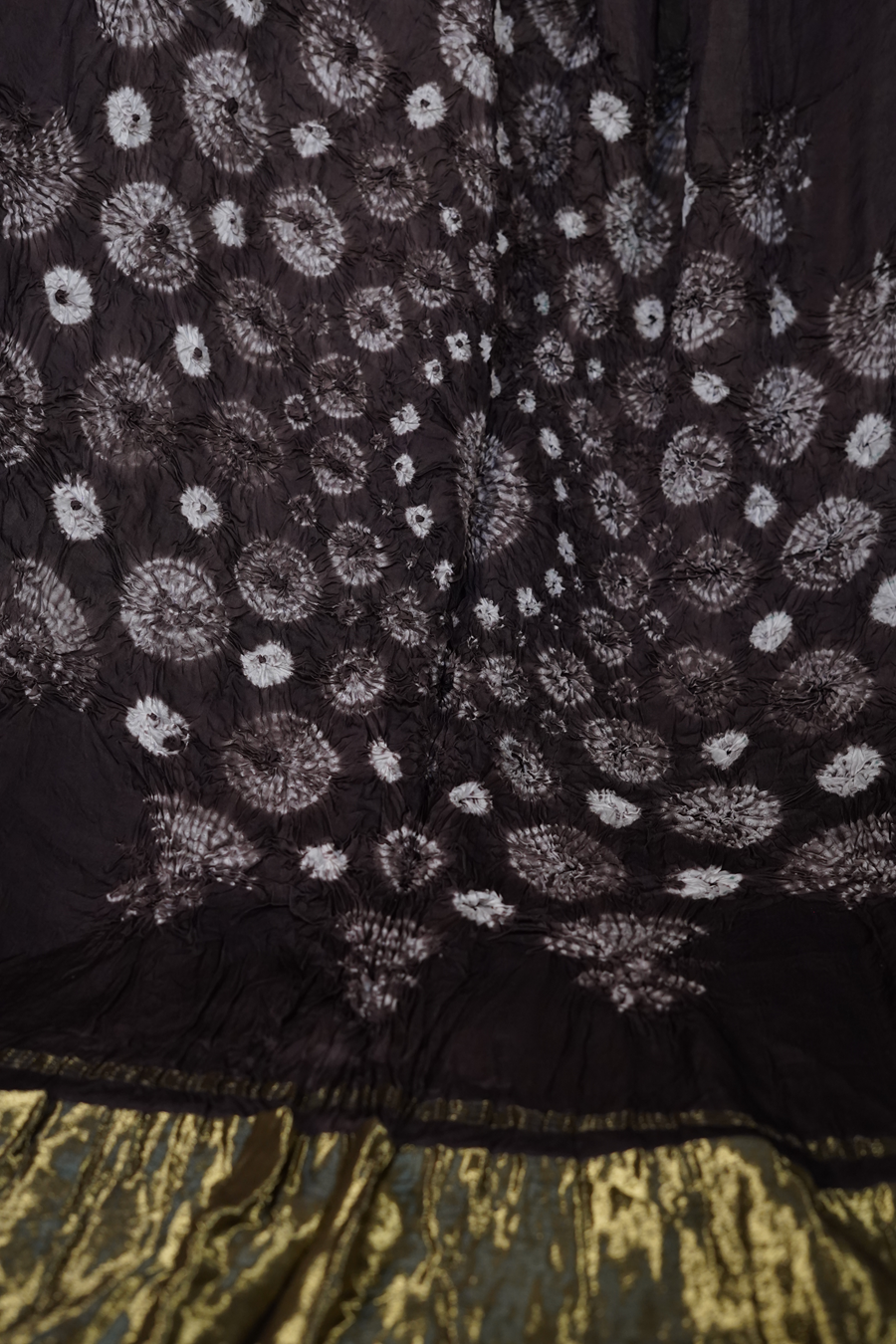 Set against a rich charcoal-brown base, the saree features delicate hand-tied white Bandhej motifs scattered across the body. The highlight lies in its Lagdi Patta pallu, where clustered floral-inspired Bandhej patterns create a dense, rhythmic design that unfolds beautifully when draped.
