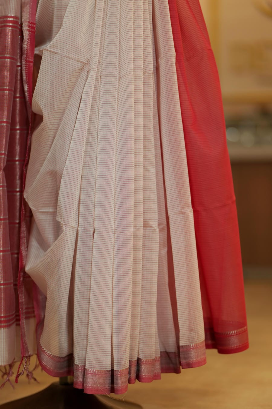 • Colour: Soft ivory body with deep sindoor-red border and pallav