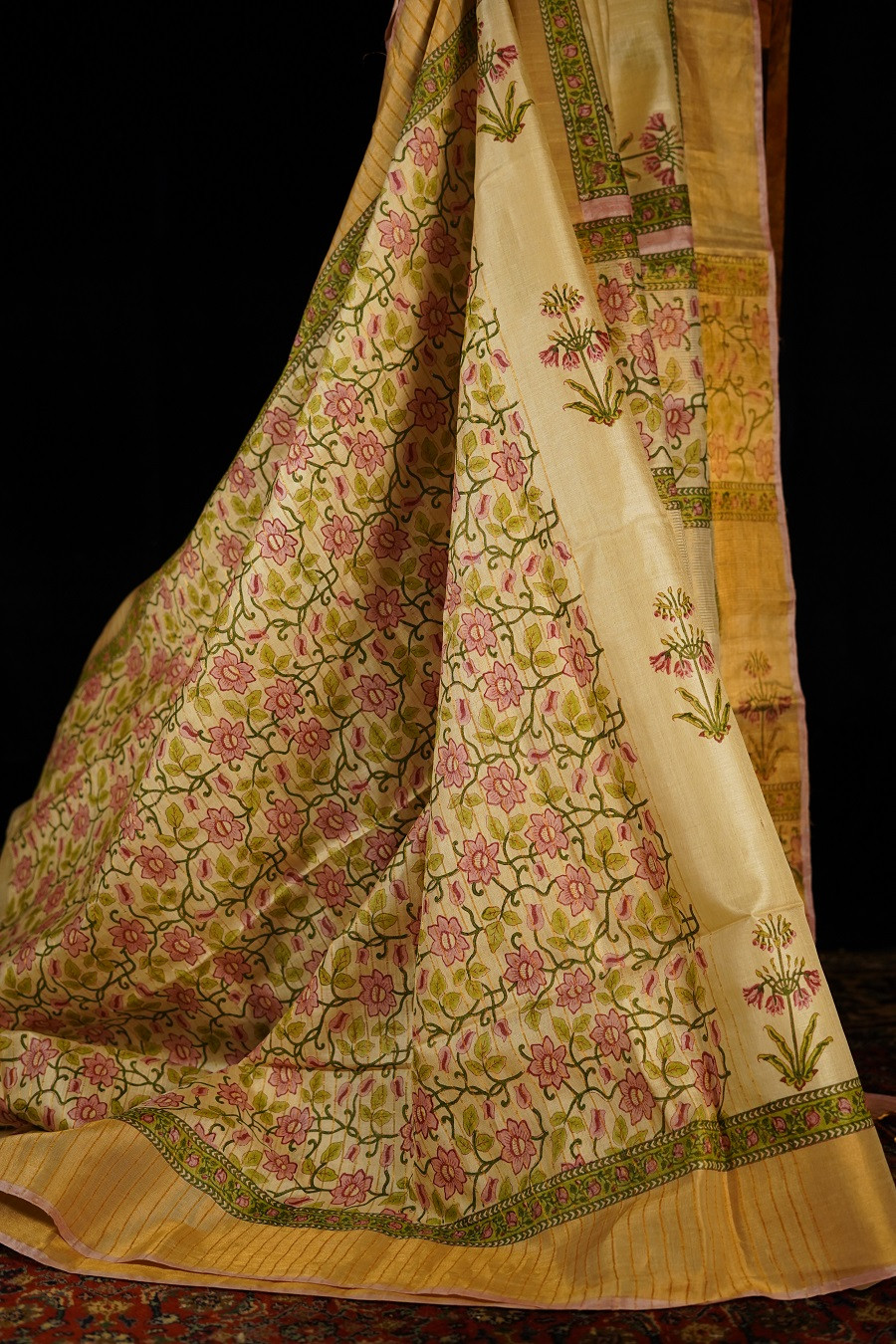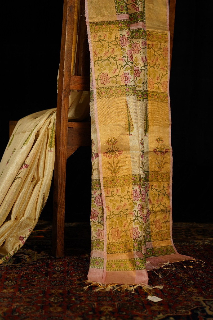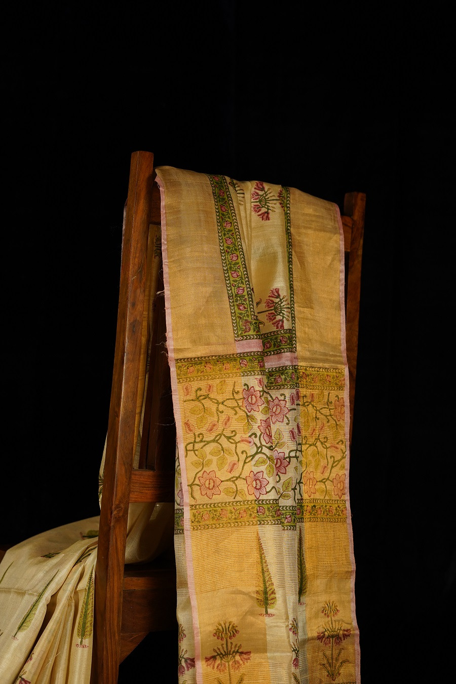 Graceful and softly expressive, The Sumukhi Kosa is crafted in pure handloom tussar silk, adorned with traditional hand block printing. The natural ivory base forms a gentle canvas for delicate floral motifs, each printed by hand, celebrating the beauty of slow, artisanal craft.
