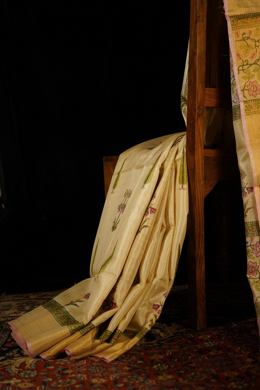 Subtle pastel borders add balance and refinement, enhancing the saree without overshadowing its organic charm. The natural texture of tussar silk lends a fluid drape and a soft matte sheen, making it both breathable and elegant.