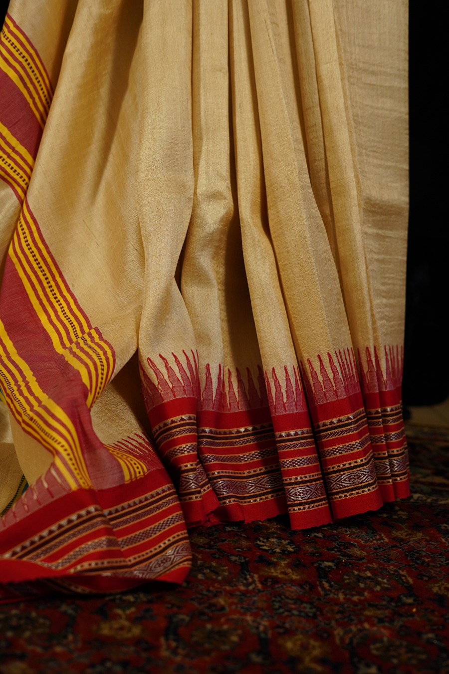 The pallu unfolds in layered stripes that echo the border hues, creating a composition reminiscent of sunlight meeting sacred earth.