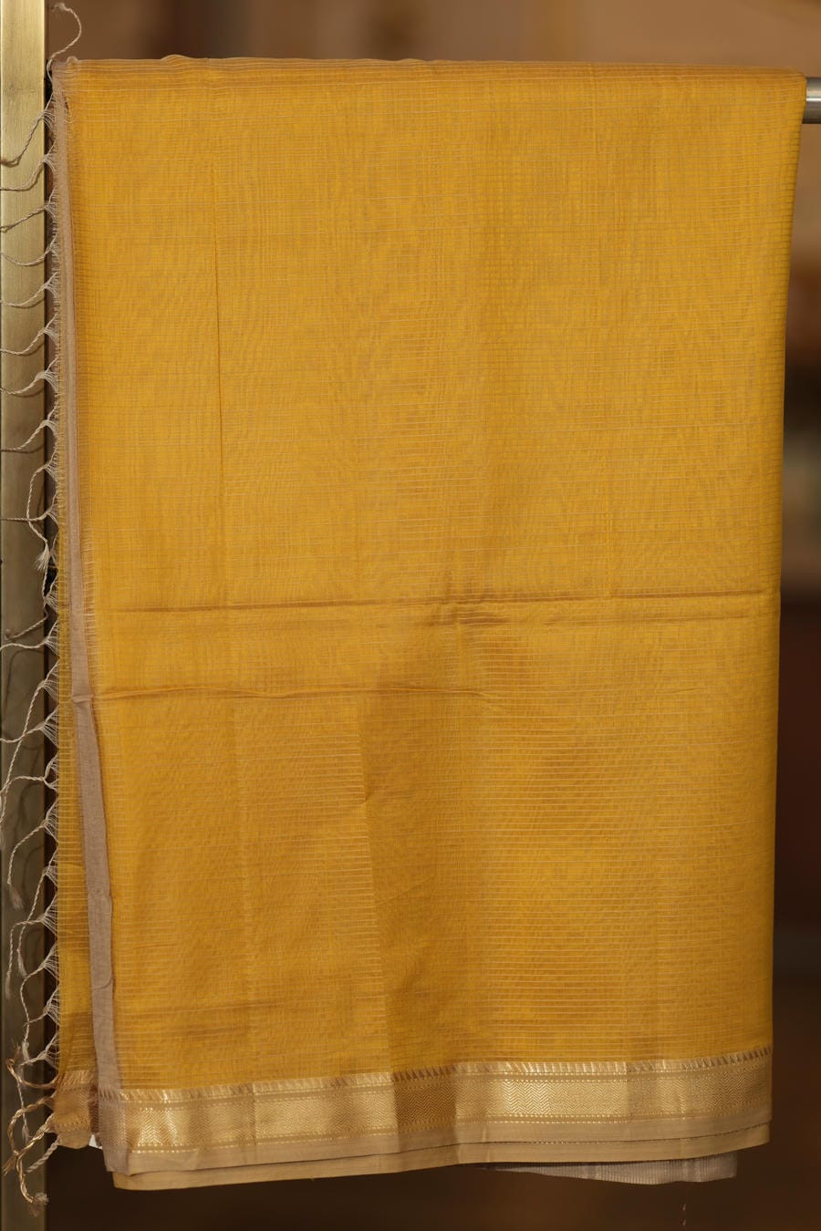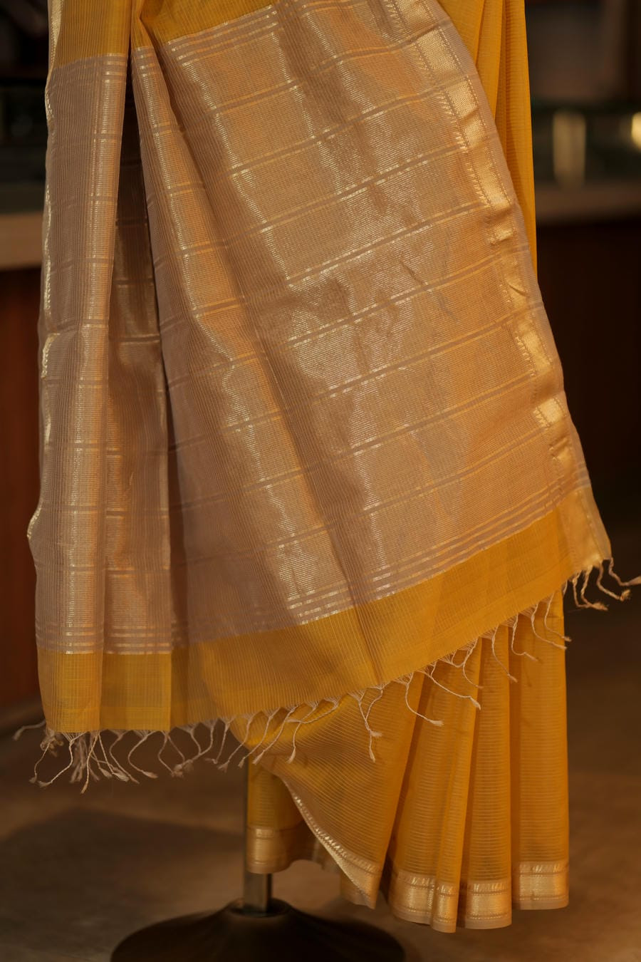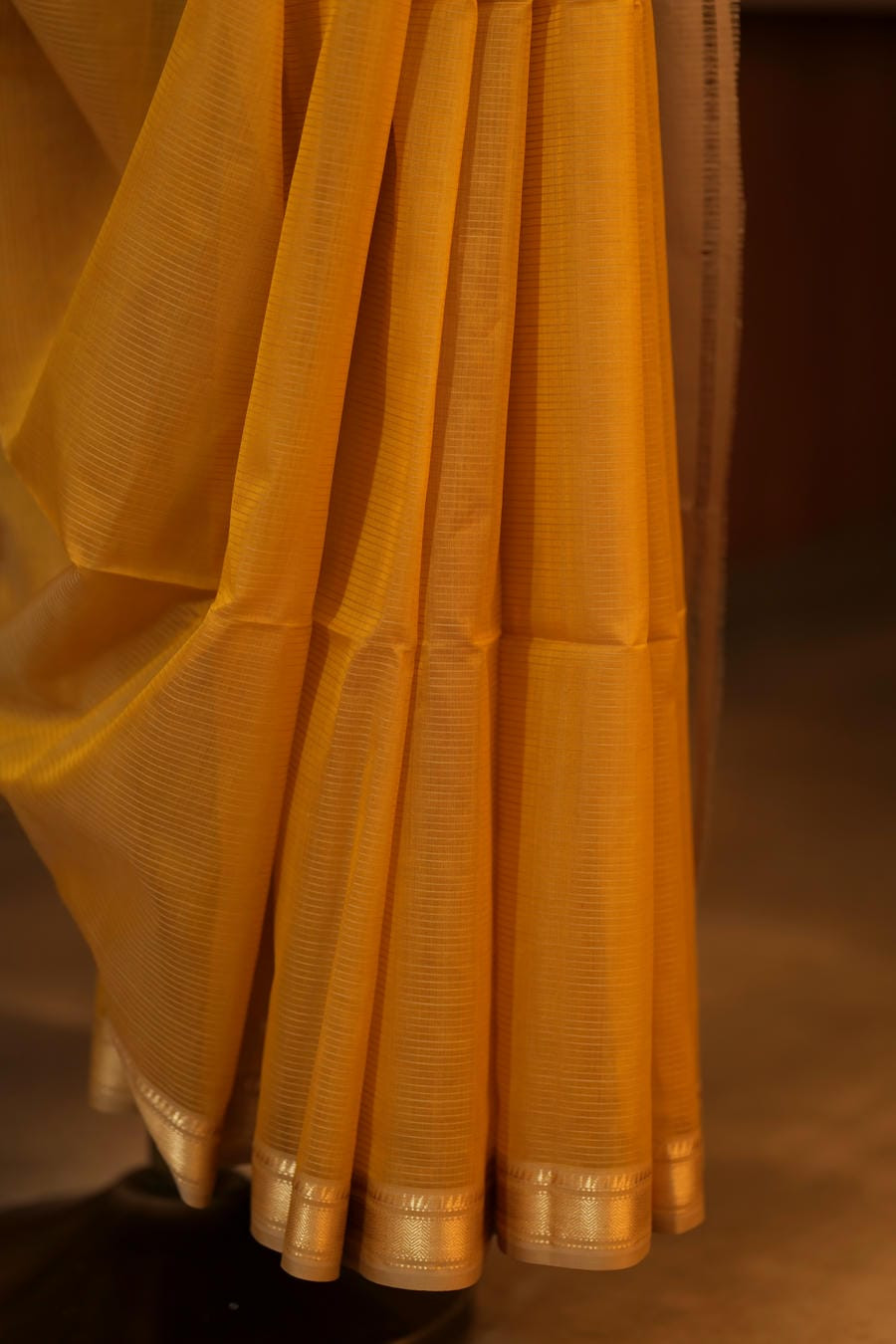 Radiating warmth and heritage, Suvarna Aabha is a graceful expression of classic Maheshwari elegance. Draped in a rich mustard yellow hue, this saree captures the soul of traditional handloom weaving while offering a refined, contemporary appeal.
