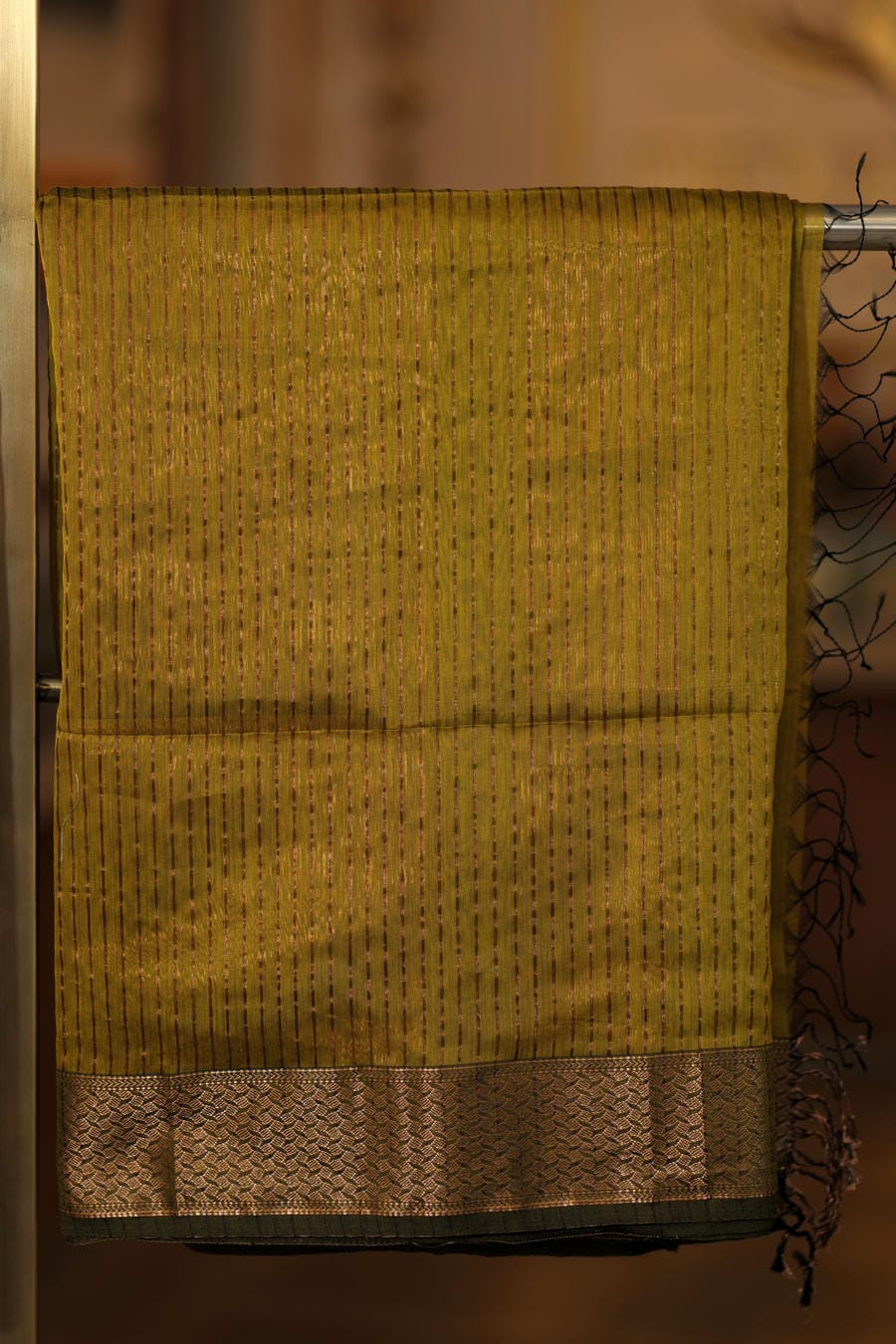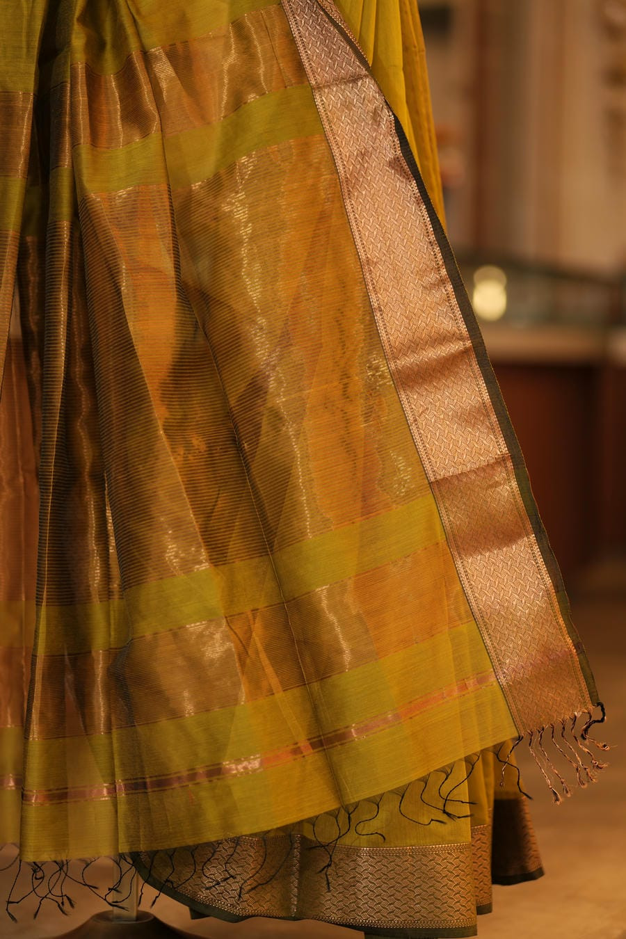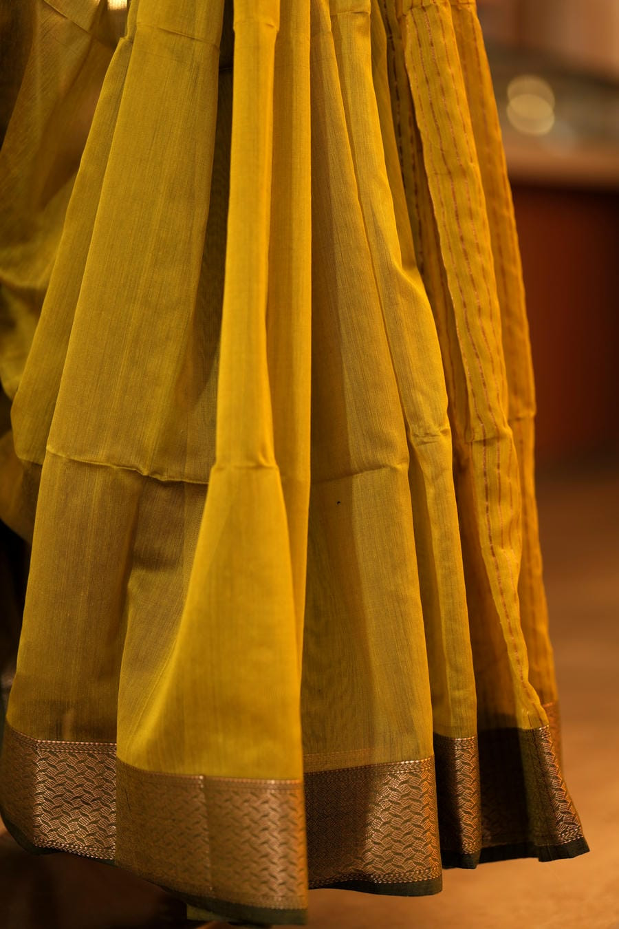 Glowing with the radiance of molten gold and the charm of timeless craft, The Suvarnalekha is a pure Maheshwari saree that embodies heritage and quiet splendour. Its rich mustard-gold body gleams with a subtle green undertone, evoking the warmth of sunlight filtering through ripened fields. The intricate copper-gold zari border and pallu shimmer with regal finesse, lending an air of festive grandeur and classic poise.Handwoven in the traditional Maheshwari technique, this saree is a testament to refined artistry — elegant for cultural occasions, temple gatherings, or any moment that calls for luminous grace.