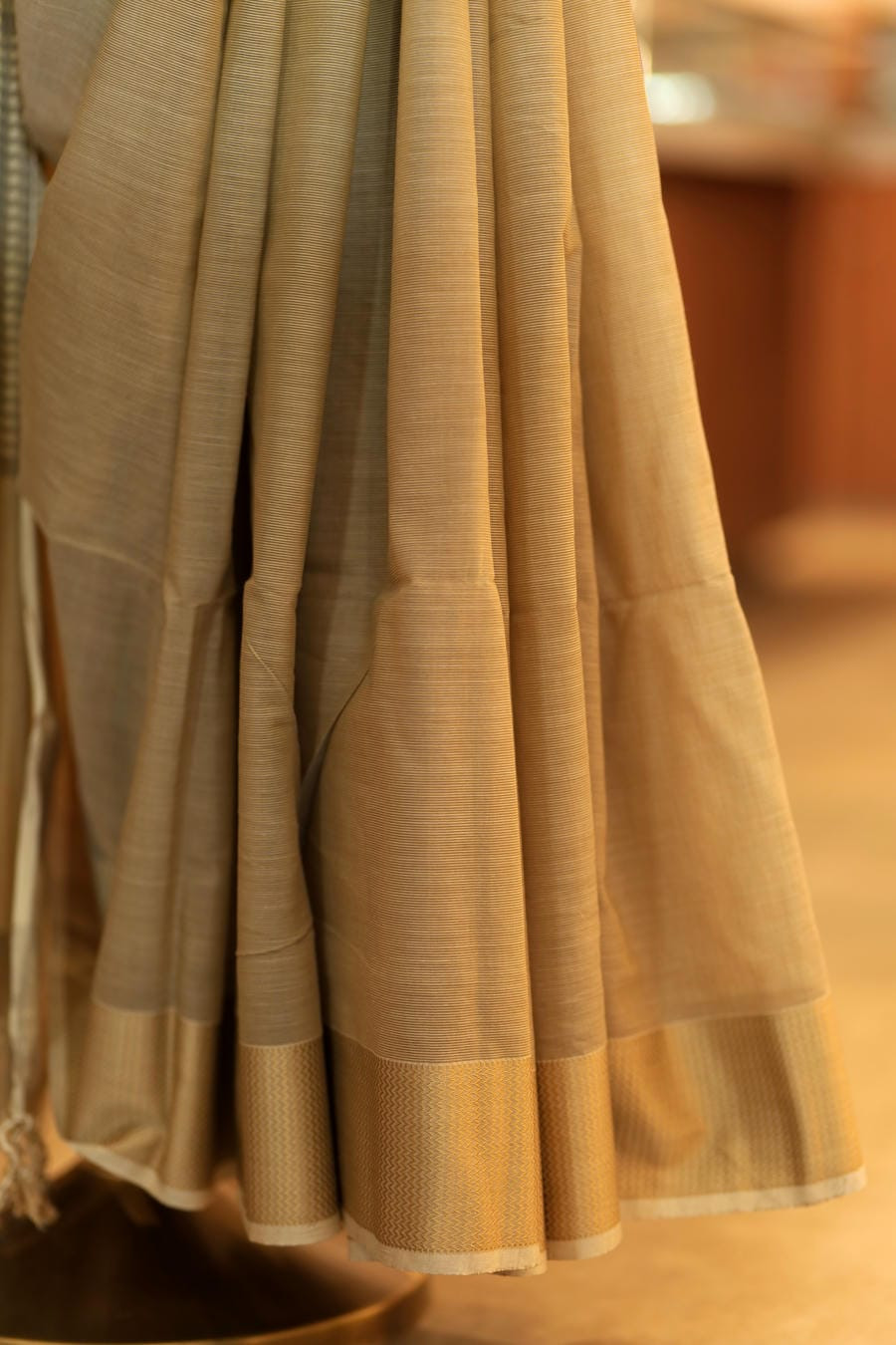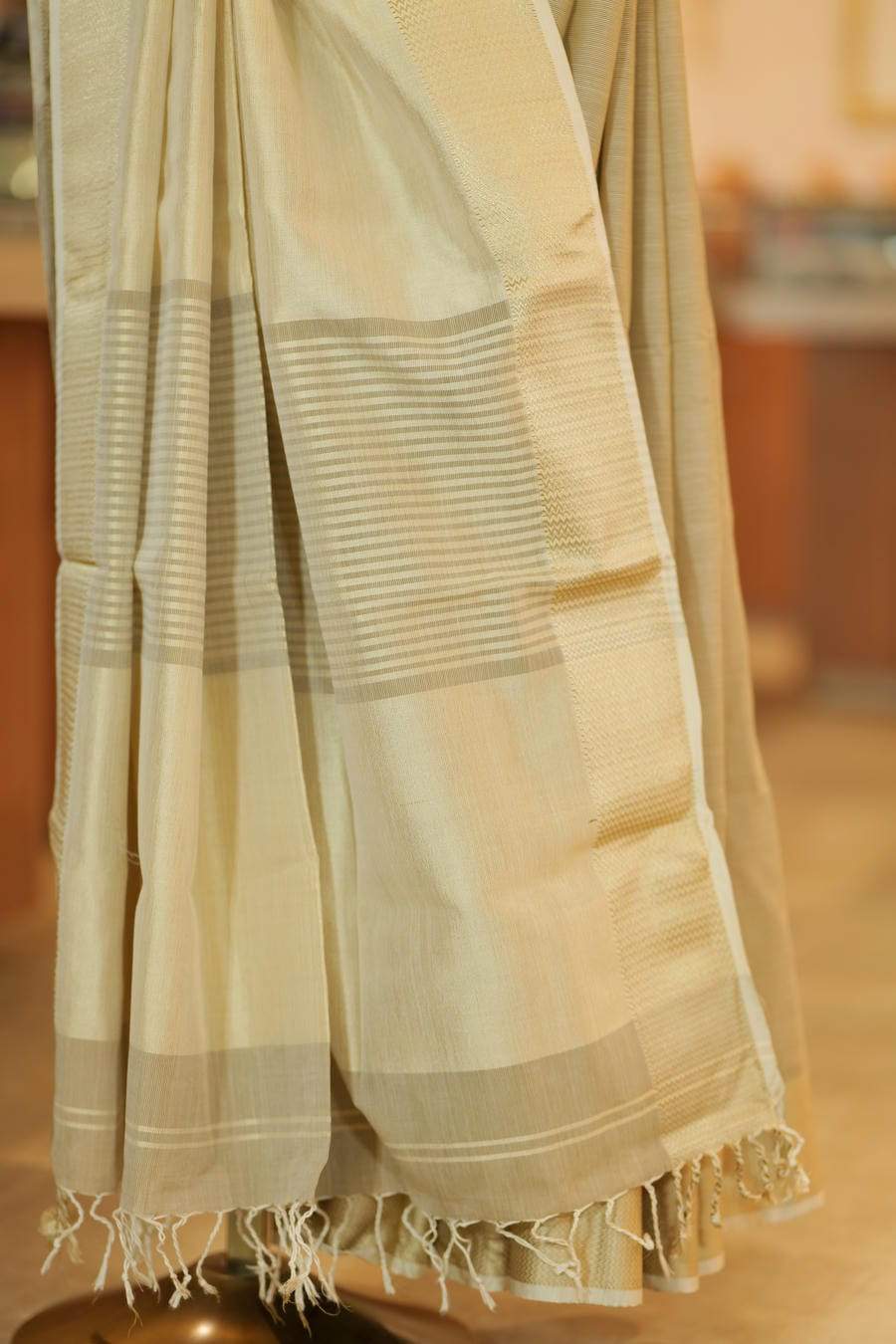A Maheshwari drape where natural hues meet refined grace, woven for timeless elegance.