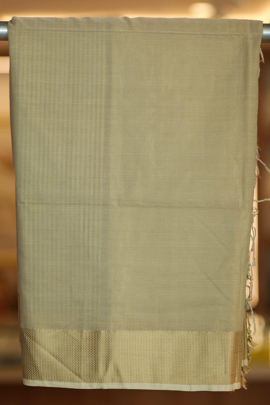 Woven in the traditional Maheshwari handloom technique, the saree is lightweight, airy, and fluid, offering effortless comfort with a graceful fall. The subtle woven border with a muted gold sheen frames the drape delicately, allowing the texture and natural colour to take centre stage. Fine linear patterns across the body add depth and character without disturbing its calm aesthetic.