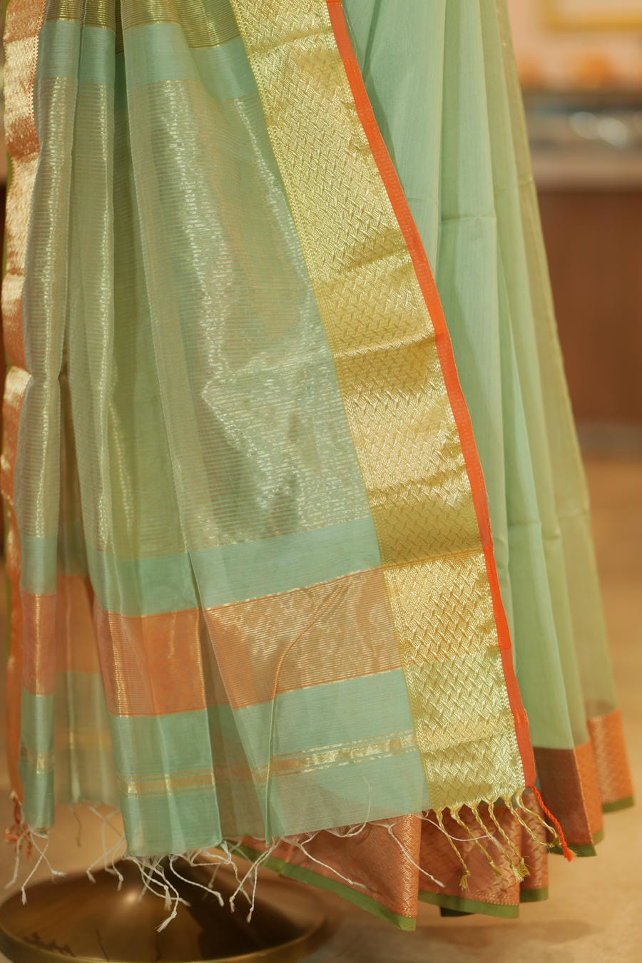 Radiant with youthful charm and serene beauty, The Tarunima is a pure Maheshwari silk-cotton saree that captures the essence of dawn's first light. Its soothing aqua-green body shimmers with fine golden stripes, reflecting the freshness of new beginnings. The elegant gold and coral-orange zari border and pallu add a warm festive glow, blending delicacy with timeless grandeur.