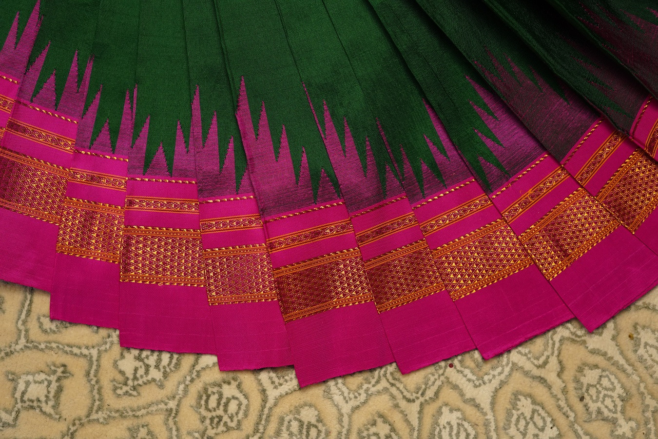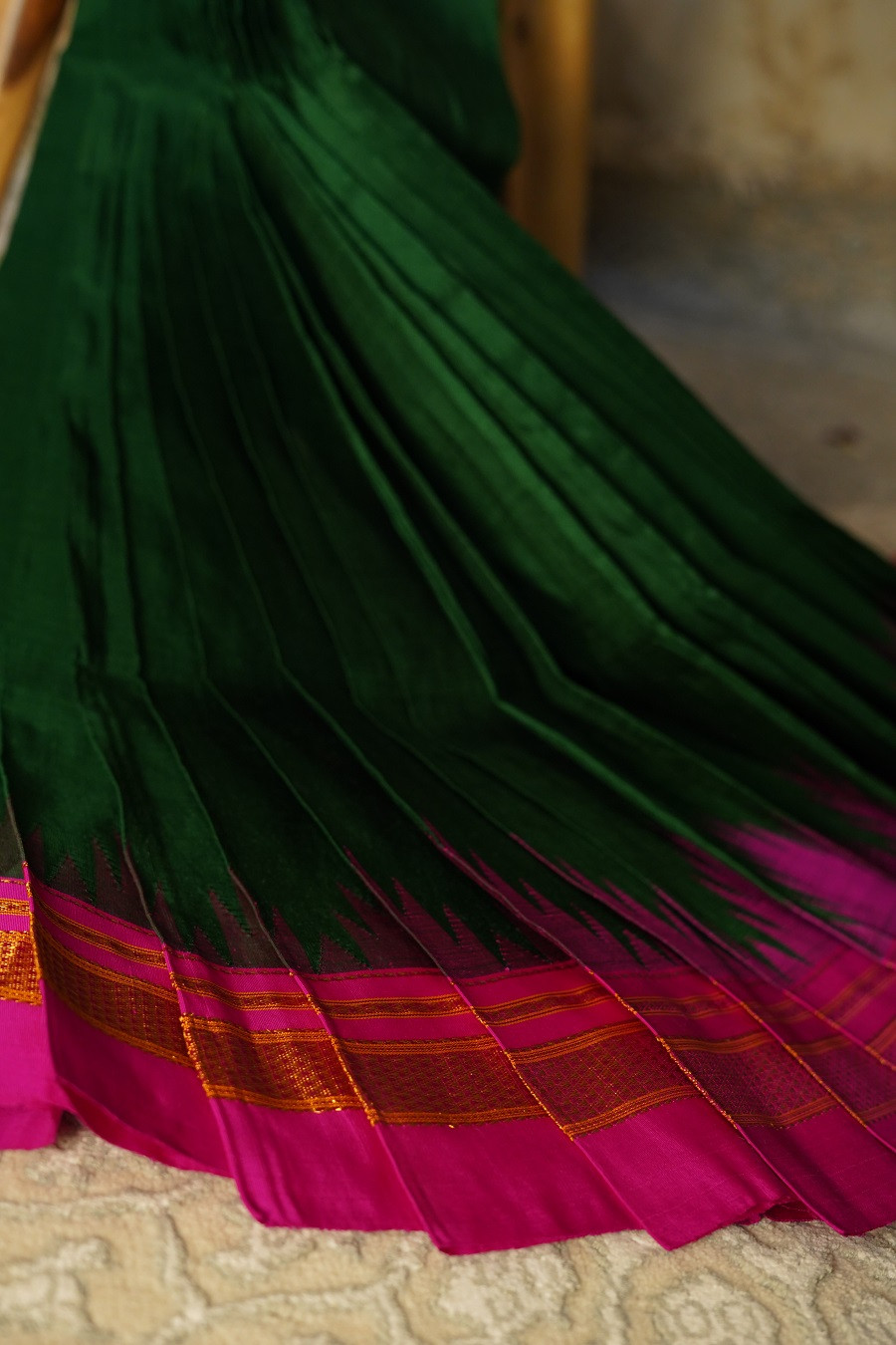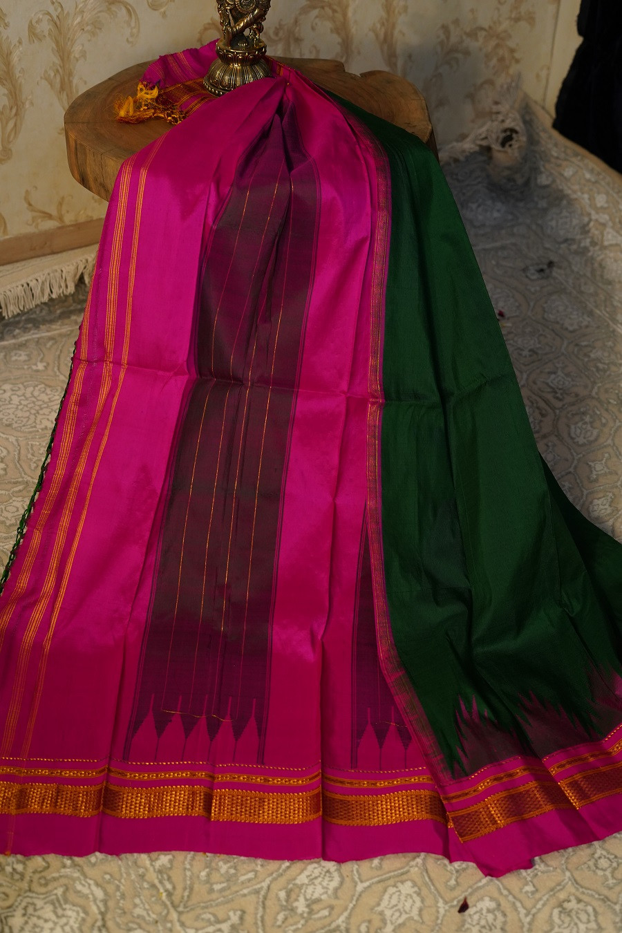 Woven in pure silk, the saree reveals a deep forest-green body — rich, serene, and commanding in presence. The vivid rani pink border and pallu create a striking regal contrast, enhanced with intricate zari detailing and the iconic temple-inspired motifs that define the timeless Ilkal weave.