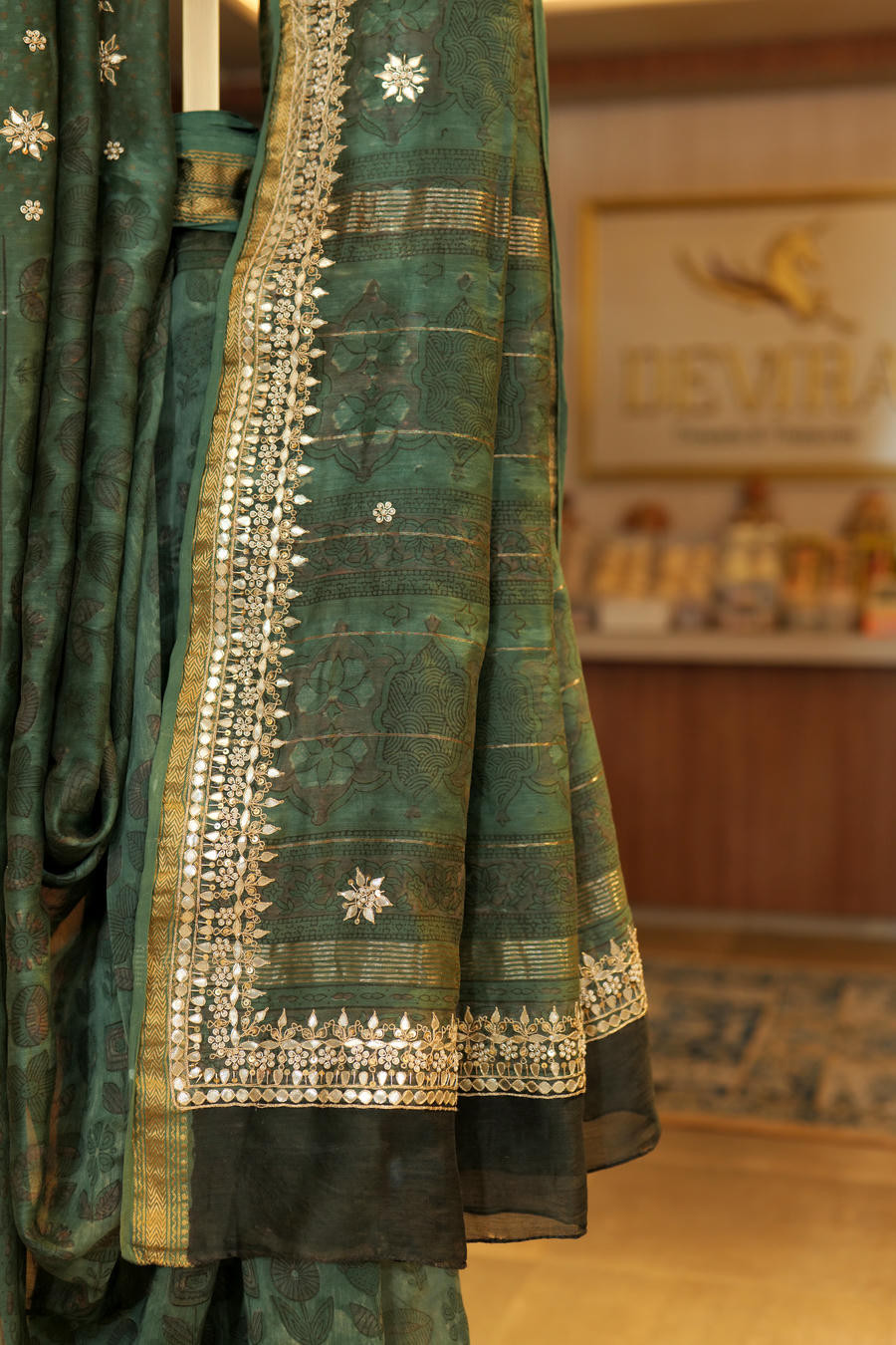 Rooted in the earth and elevated by artistry, Bagh-e-Bagru is a celebration of timeless Bagru craftsmanship infused with delicate handwork. Crafted in a deep, serene forest green hue, this saree carries the quiet elegance of nature and the soul of Rajasthan's age-old textile traditions.
