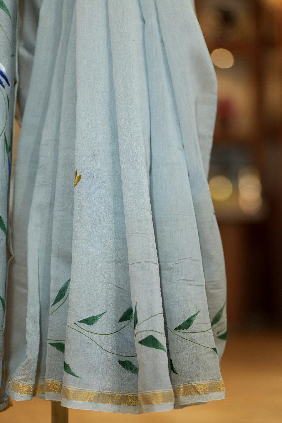 The Ash Garden is a hand-painted cotton saree set on a soft grey base, where floral forms appear gently scattered, painted freehand with calm, flowing strokes. The muted tone allows the artwork to feel quiet, balanced, and understated.