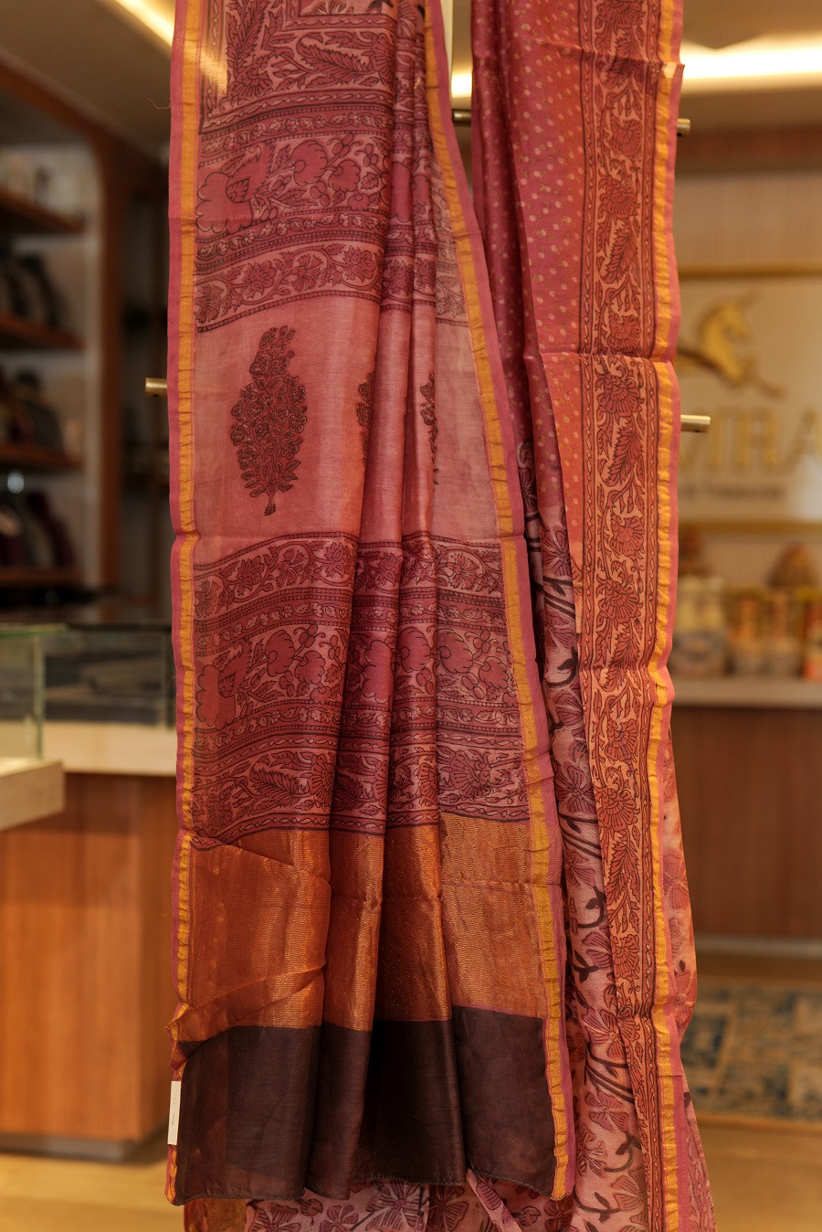 Set on a warm gulabi-pink base, the saree is delicately adorned with fine handblock butis, patiently printed using hand-carved wooden blocks. The borders and pallu unfold with intricate floral and vine motifs, echoing the richness of Rajasthani textile traditions while maintaining a refined, understated charm.