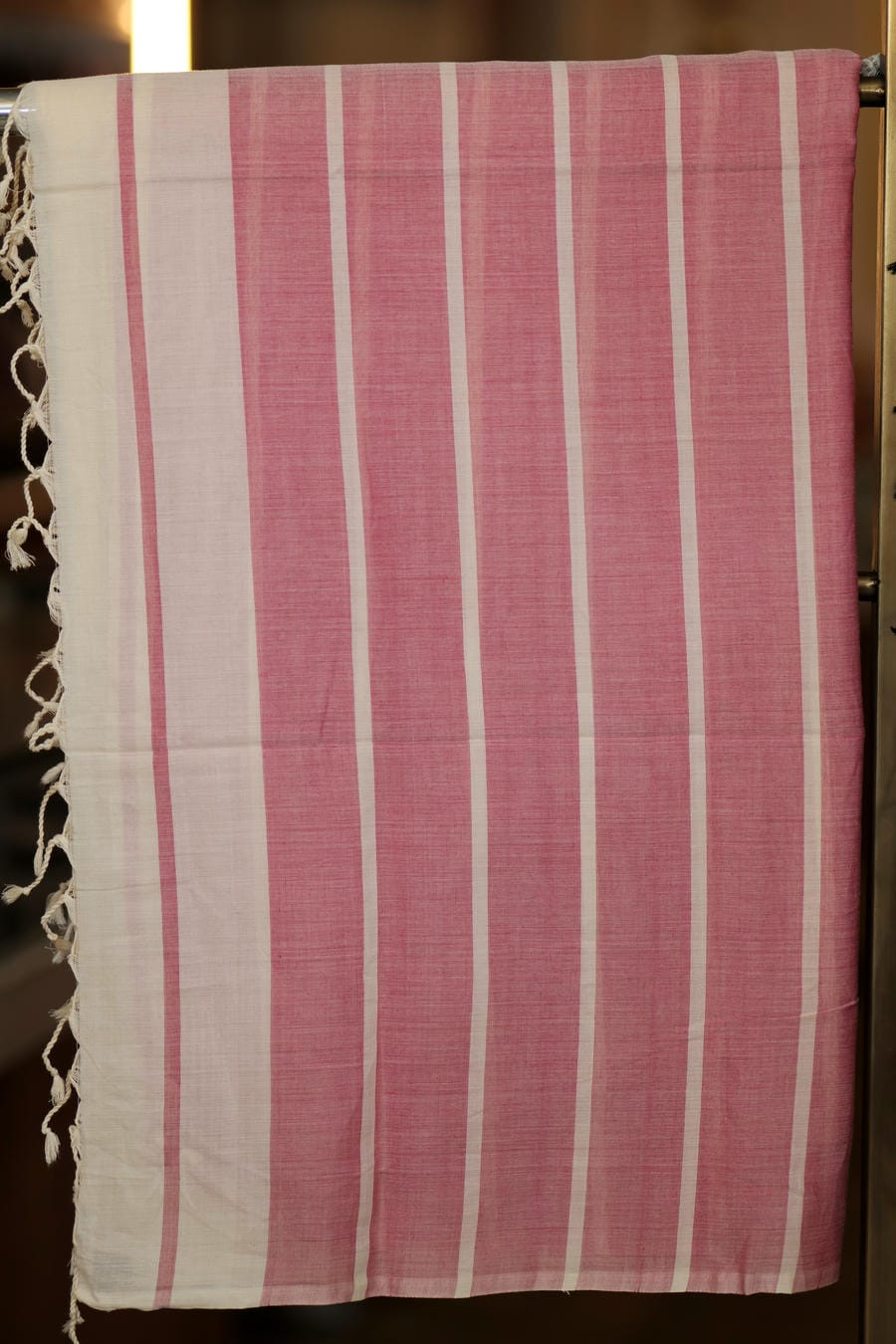 Delicate rose-pink stripes along the pallav and border add a gentle touch of colour, creating a look that is both fresh and timeless. The understated design highlights the beauty of Maheshwari weaving, making this saree ideal for everyday elegance, warm climates, and relaxed celebrations.