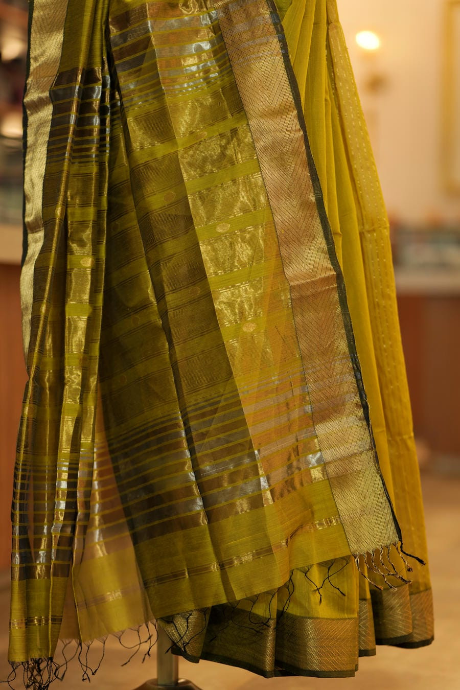 An ode to harmony and heritage, The Hariprabha is a pure Maheshwari saree that captures the resplendence of green and gold — colours long cherished in Indian tradition for prosperity and grace. Handwoven with luminous zari borders and a subtle golden sheen, this saree mirrors the tranquil glow of sunlight filtering through lush canopies. Its featherlight silk-cotton weave drapes with effortless grace, exuding poise and quiet luxury.