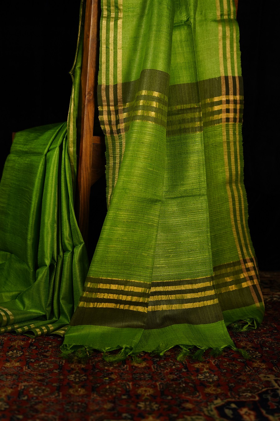 Fresh, grounded, and quietly radiant, The Harit Kosa is woven in pure Tussar (Kosa) Silk, celebrated for its organic texture and soft, natural sheen. The vibrant green hue evokes new leaves and fertile landscapes, carrying a sense of vitality balanced by calm elegance.