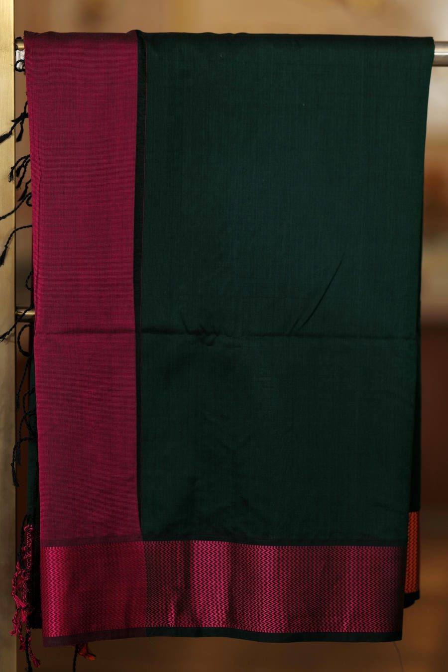 A celebration of nature's quiet opulence, The Haritmayi is a pure Maheshwari saree that embodies the soulful elegance of Indian handloom tradition. Draped in deep forest green, its body reflects serenity and depth, beautifully framed by magenta borders intricately woven with fine zari-inspired patterns and a touch of burnt orange for a subtle radiance.