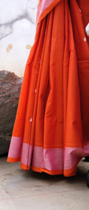 The body is adorned with delicate white butis that create a gentle, rhythmic pattern across the textured handloom weave. Light yet structured, the fabric drapes gracefully, making it perfect for long celebrations and traditional gatherings.