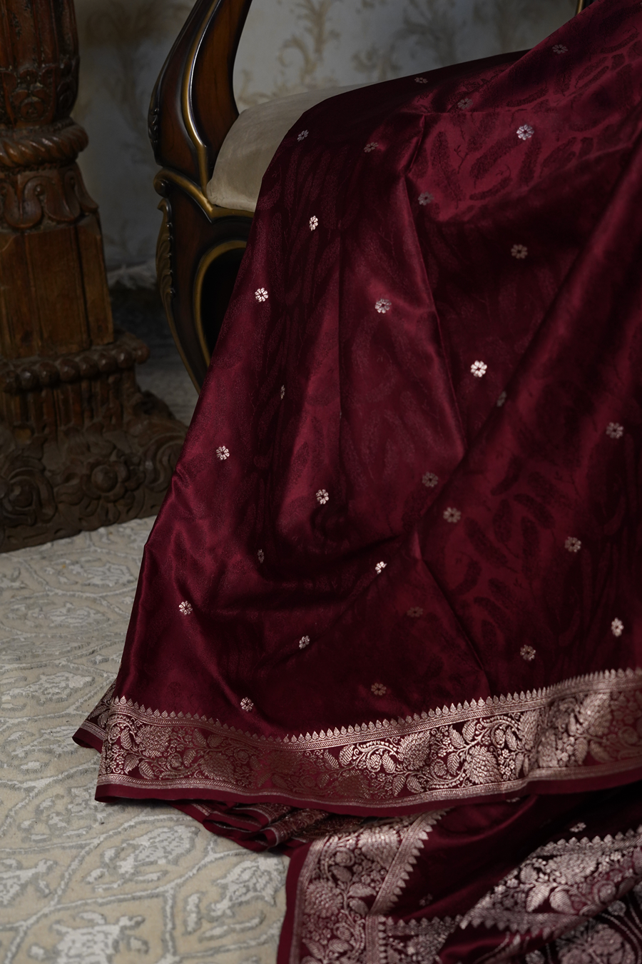 The body features delicate silver zari butis scattered gracefully across the lustrous fabric, adding a refined shimmer. The ornate silver zari border and grand pallu are woven with traditional Banarasi floral and heritage motifs, creating a striking contrast against the rich maroon base.