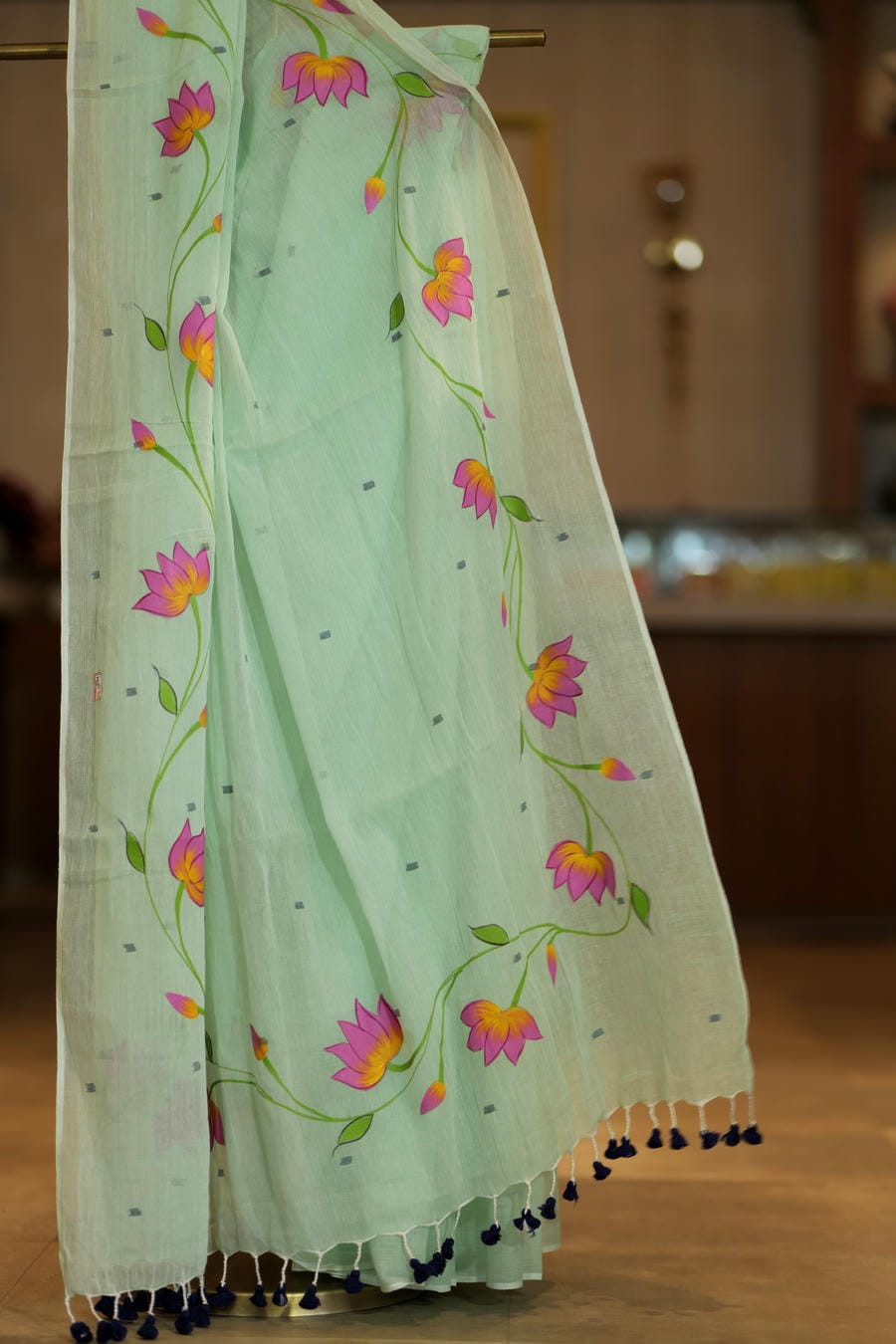 Each saree is individually hand-painted, resulting in subtle variations that make every piece unique. Crafted in breathable cotton, the fabric offers a light, airy drape that is comfortable for all-day wear. Minimal detailing keeps the focus on the hand-painted florals and the calm character of the saree.