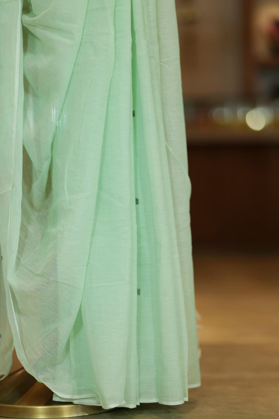 Mint Garden is a hand-painted cotton saree set on a soft mint green base, adorned with delicate floral motifs painted freehand along the drape. The artwork appears light and fluid, with gentle lines that keep the overall look fresh and understated.
