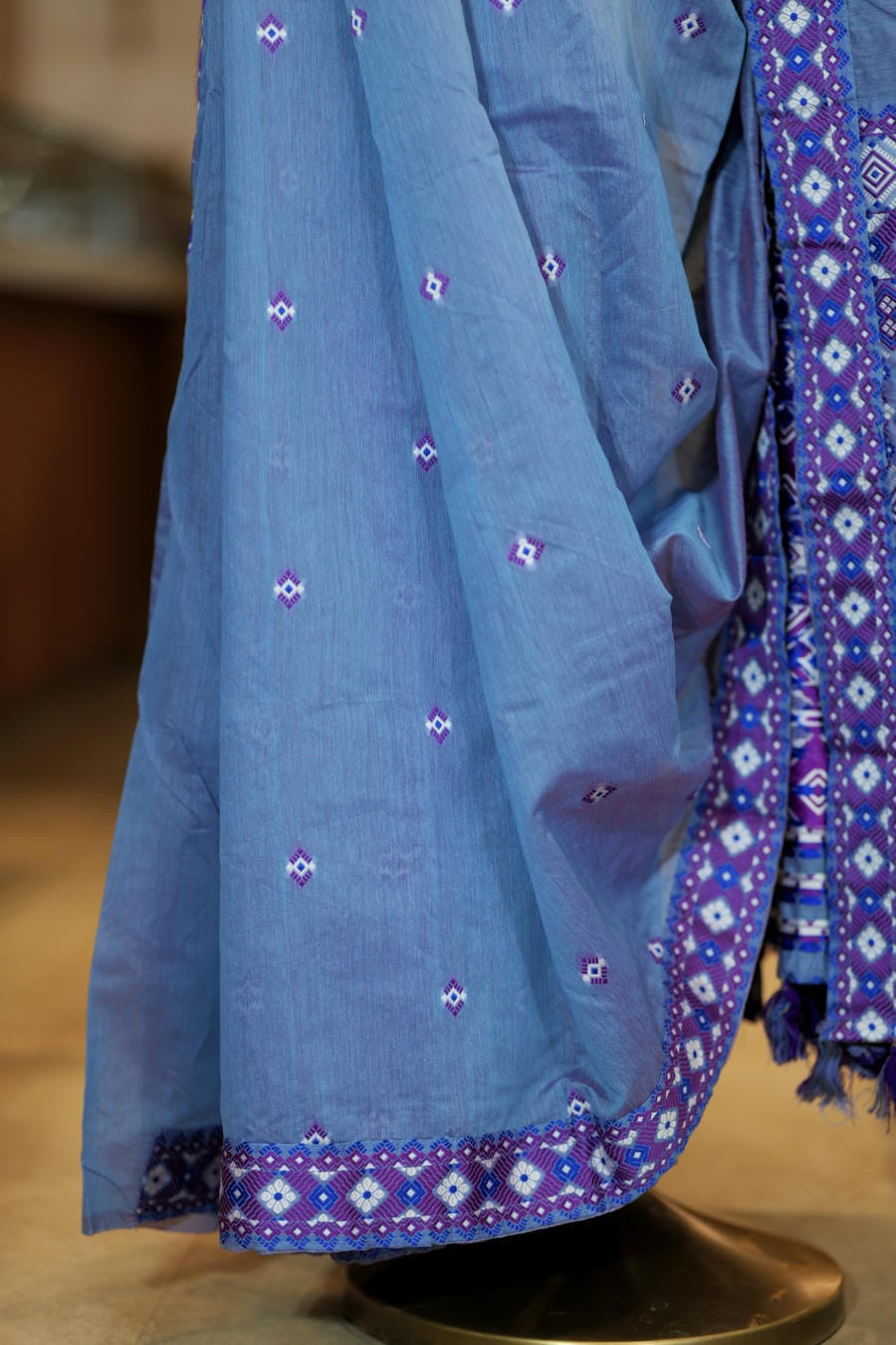 Delicate woven butis are scattered across the fabric, adding gentle detail, while the richly patterned border and pallu feature traditional geometric motifs in deeper blue and ivory tones. Hand-finished tassels complete the pallu, highlighting the saree's artisanal character.