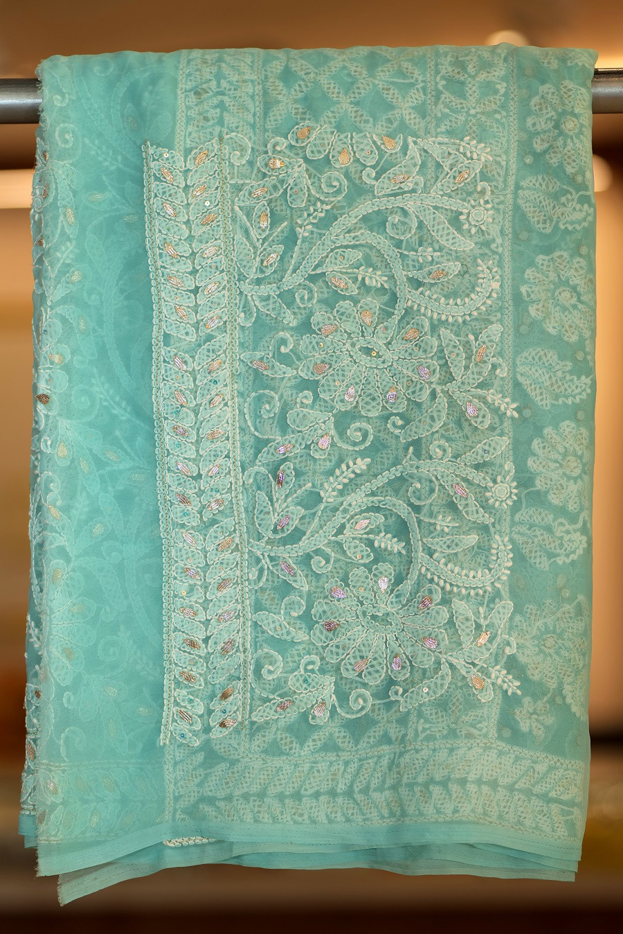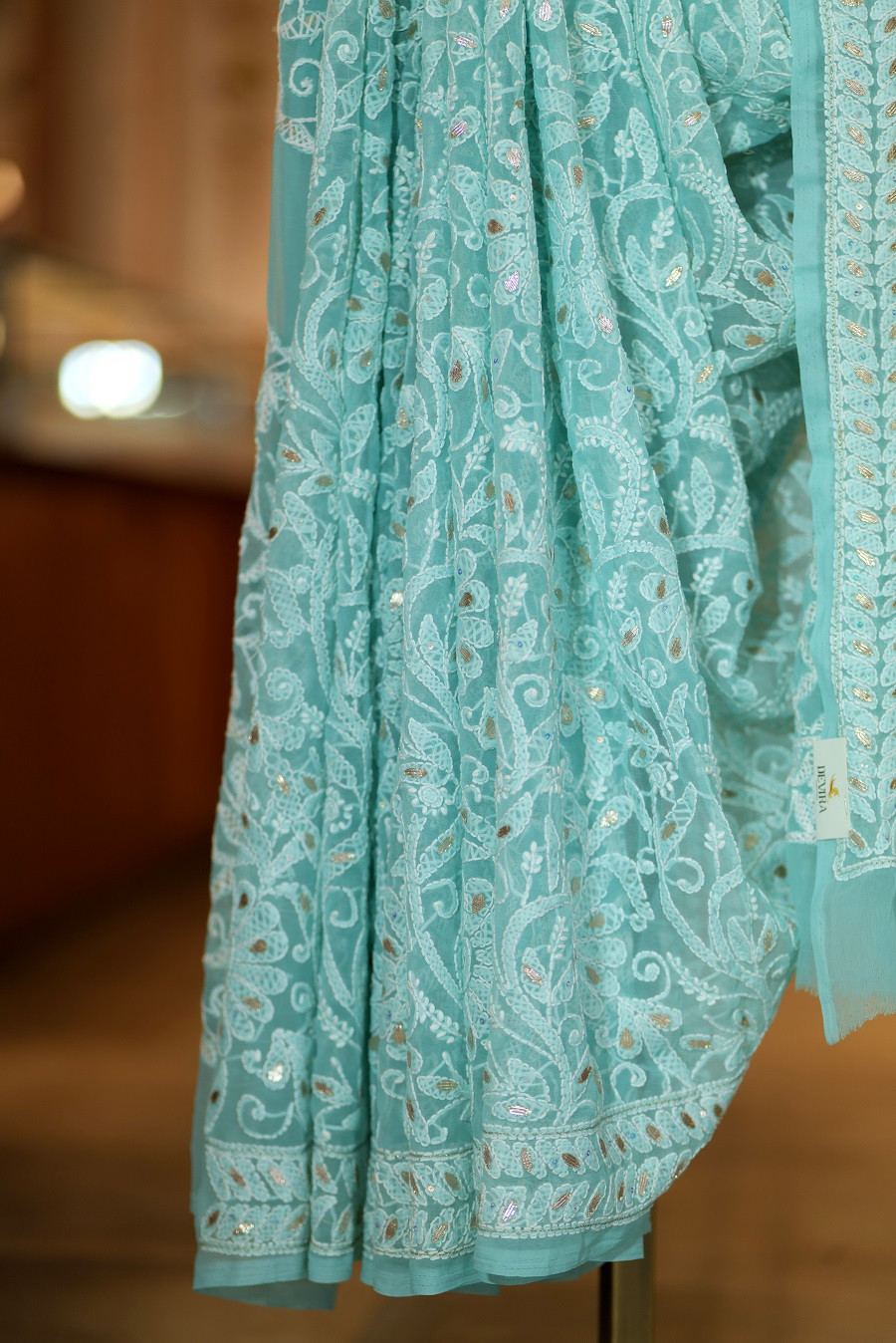Work: Hand-embroidered Lucknowi Chikankari with refined Gota Patti accents