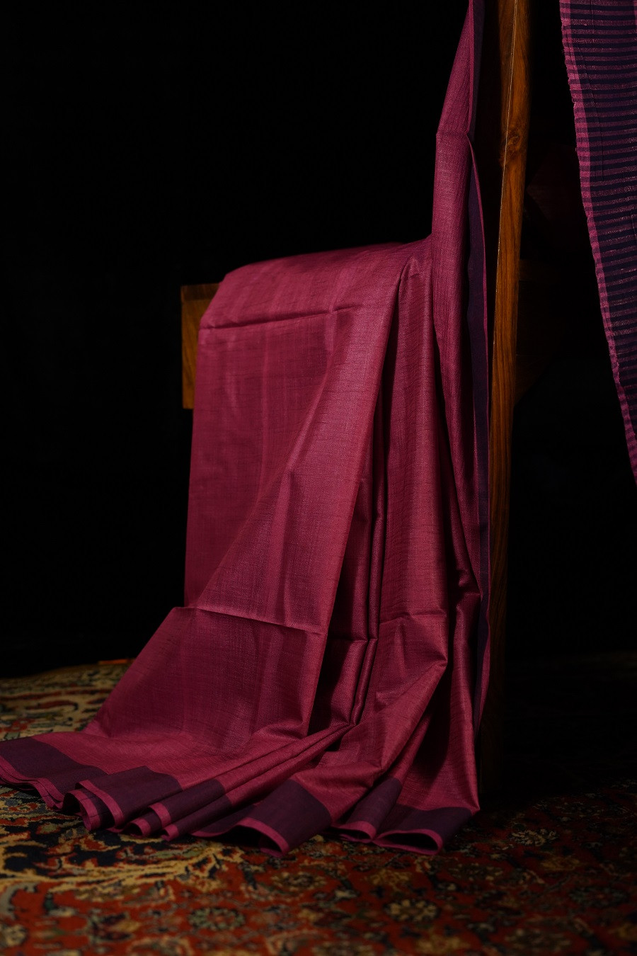 Deep, resonant, and quietly expressive, The Raga Kosa is woven in pure Tussar (Kosa) Silk, admired for its organic texture and soft, natural sheen. The rich wine-magenta hue carries a soulful depth, unfolding beautifully across the body and pallu.