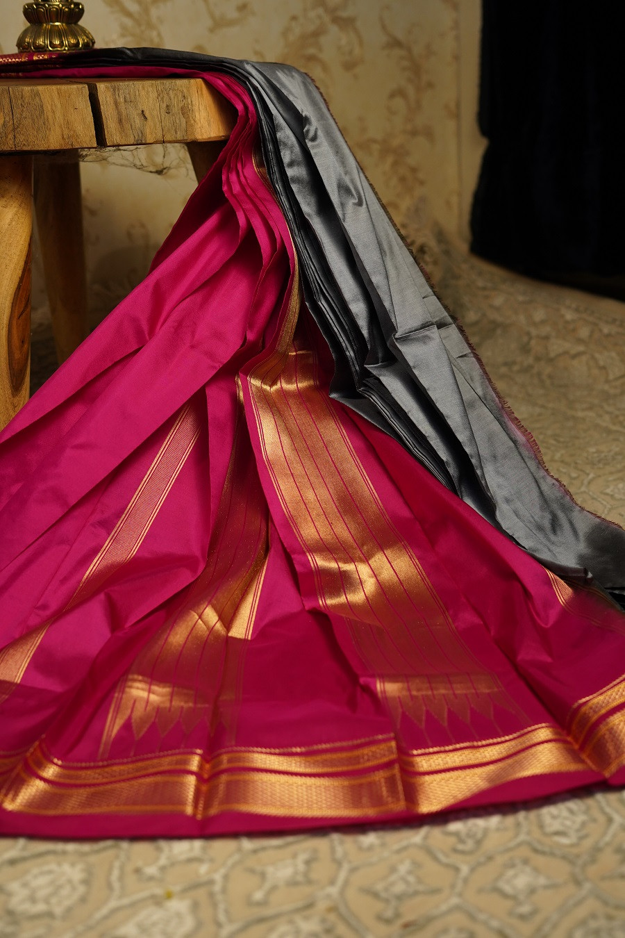 Woven in pure silk, the saree unfolds in a deep charcoal-grey body — intense, commanding, and quietly powerful. It is dramatically framed by a resplendent rani pink border and pallu, enriched with intricate zari craftsmanship that gleams with ceremonial grandeur. The iconic Ilkal construction, where the body and pallu are woven separately and united through the age-old tope teni technique, speaks of generational skill and uncompromising authenticity.