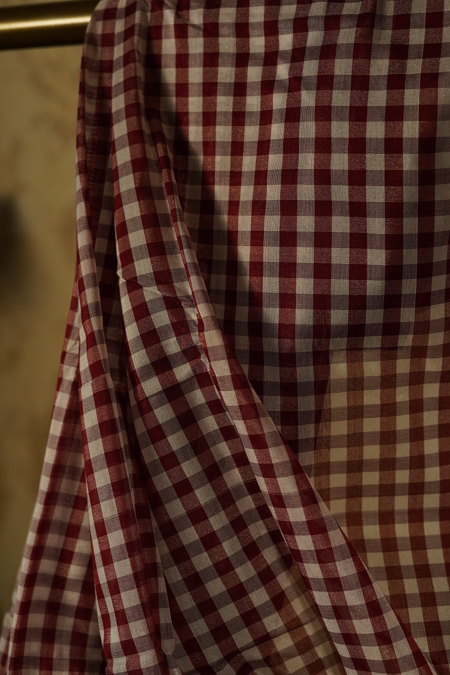 Crafted in a breathable cotton silk blend, the saree features a finely structured maroon and ivory checkered body - disciplined, elegant, and rich in traditional character. The deep maroon border and pallu are elevated with intricate zari detailing and signature temple-inspired motifs, lending ceremonial brilliance to the rhythmic pattern.