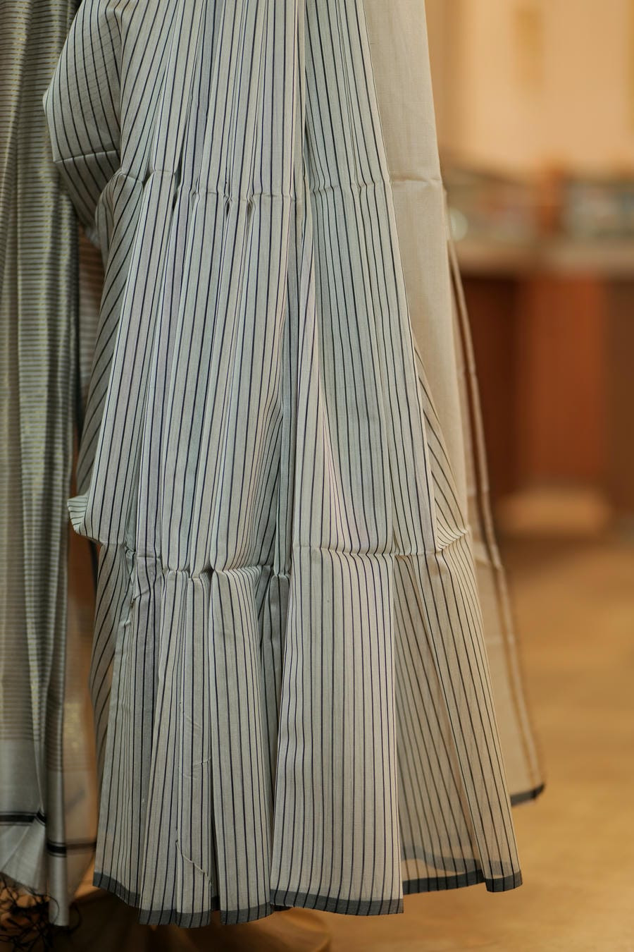 • Colour: Soft ivory-grey with fine stripe detailing and subtle silver-grey zari border
