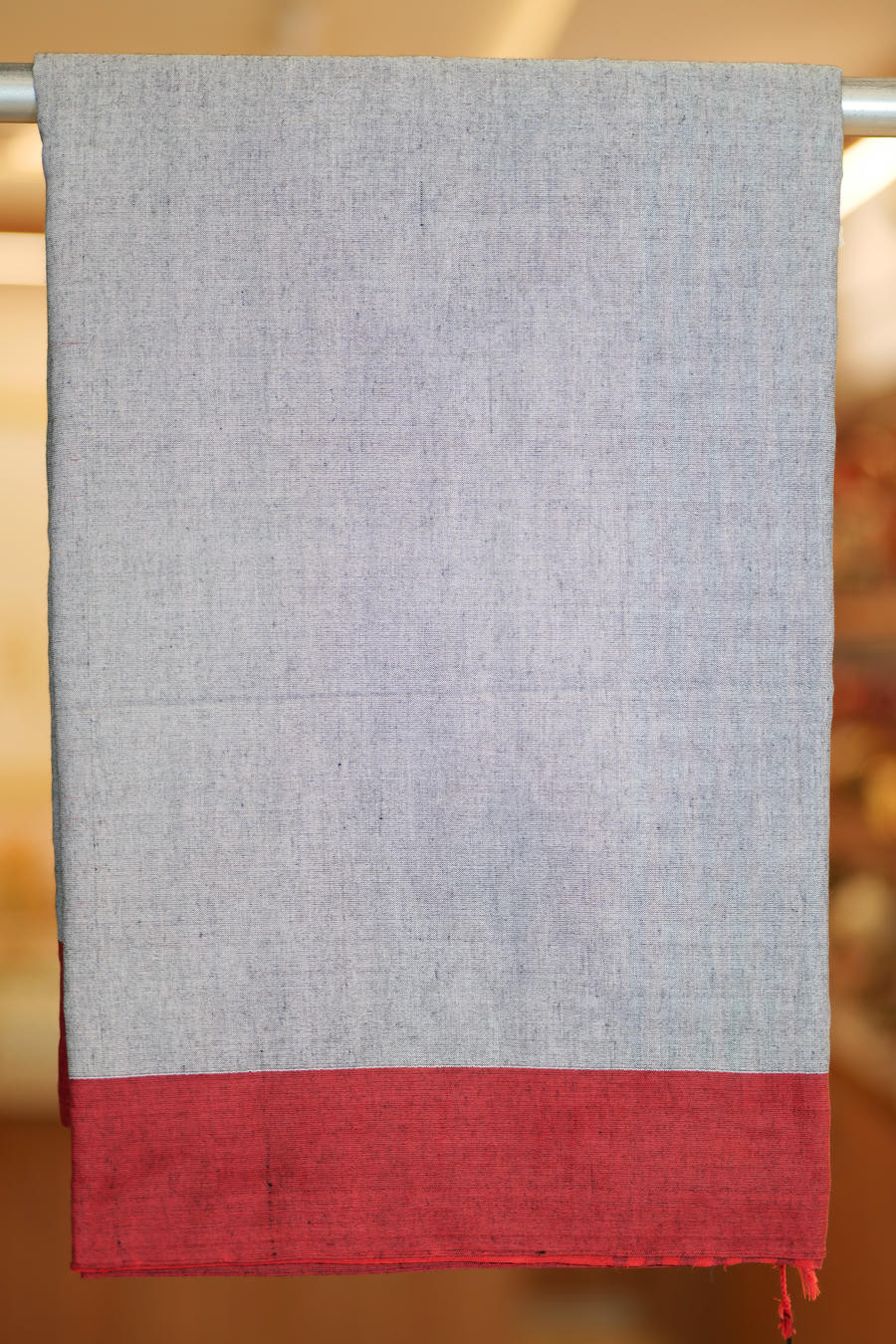 Grounded and expressive, The Rakt-Dhusor Sandesh is a pure cotton Kolkata saree that brings together contrast and calm in perfect balance. The soft grey body forms a composed canvas, patterned with rhythmic geometric motifs that echo Bengal's enduring design language.