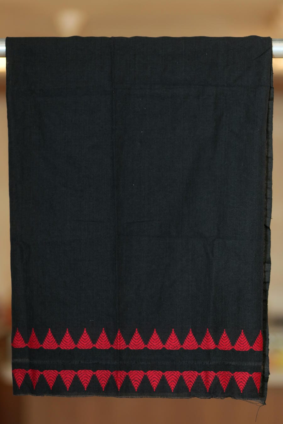 Woven in the looms of Assam, this pure cotton saree embodies quiet strength and timeless contrast. The deep black base is elevated by vivid red woven patterns that draw inspiration from traditional geometric forms, creating a look that is bold yet rooted in heritage.
