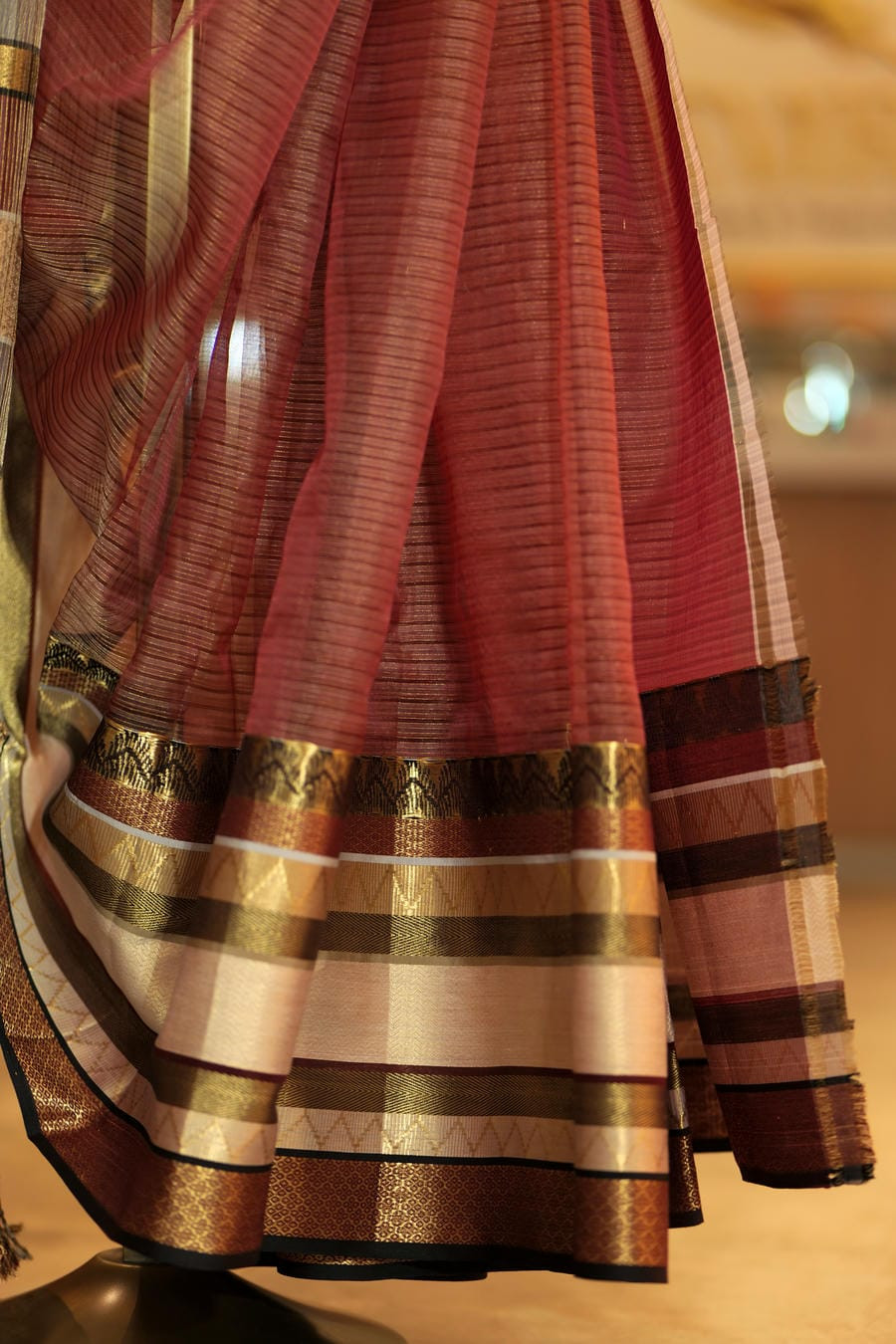 • Border & Pallu: Antique gold zari with geometric motifs