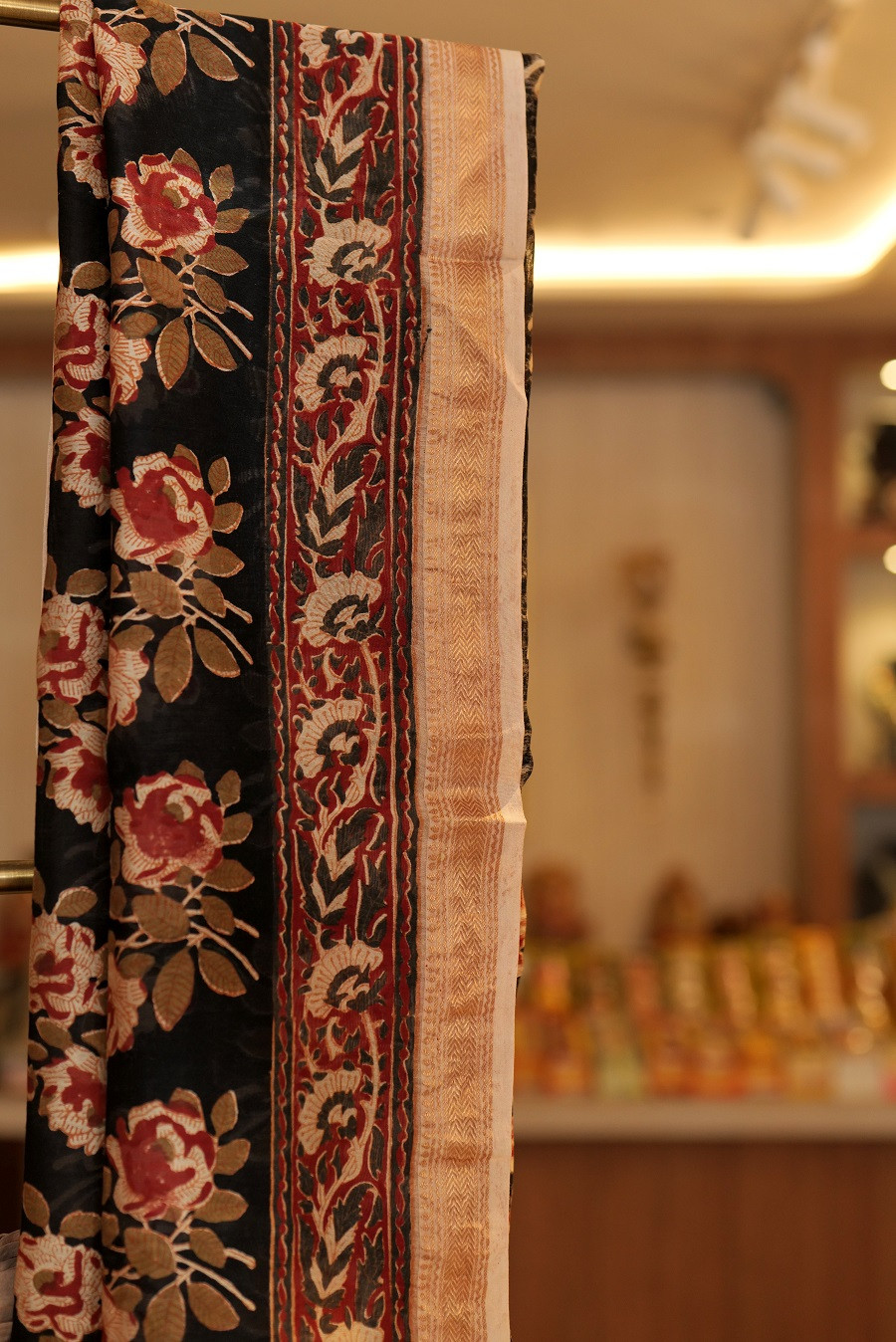 Step into timeless elegance with Rangrez Raat, an authentic Bagru hand block print saree inspired by the mystical beauty of Rajasthani nights. Draped in a deep charcoal-black base, this masterpiece is adorned with delicate floral creepers in earthy rust and maroon hues. The contrasting beige-red traditional border frames the saree with regal charm, while the richly detailed pallu reflects the finesse of heritage Bagru craftsmanship.