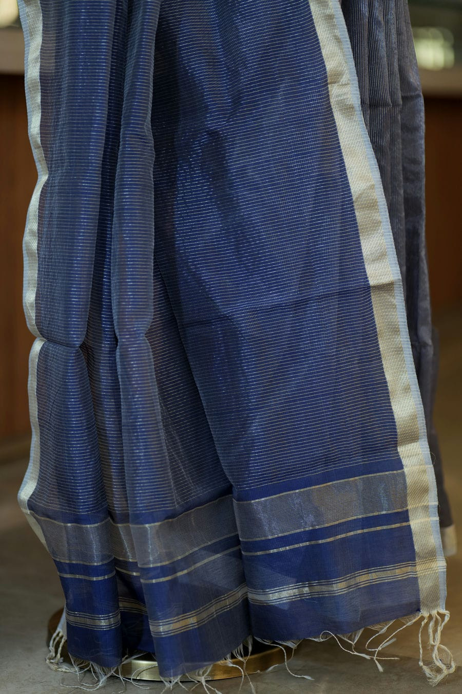 The saree comes paired with a coordinated sapphire blue blouse featuring delicate silver stripes - adding a refined contrast and completing the look with subtle sophistication.