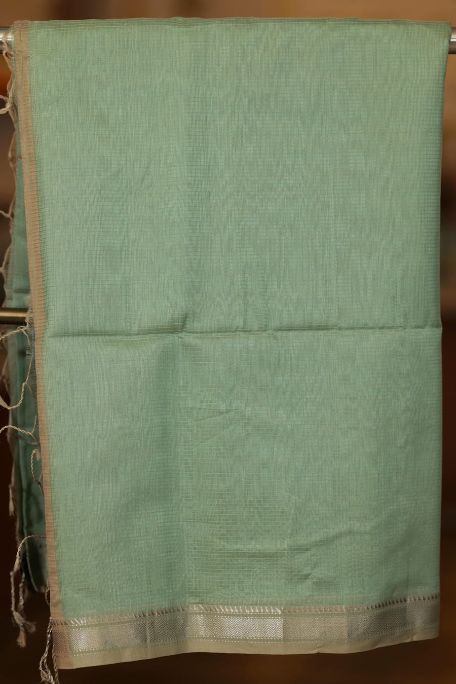 Soft, serene, and effortlessly refined, Saumya Rekha is a pure Maheshwari saree that embodies calm elegance and timeless simplicity. Woven in a gentle sage-mint green hue, the saree carries a soothing presence, enhanced by a subtle golden undertone that adds warmth without excess.