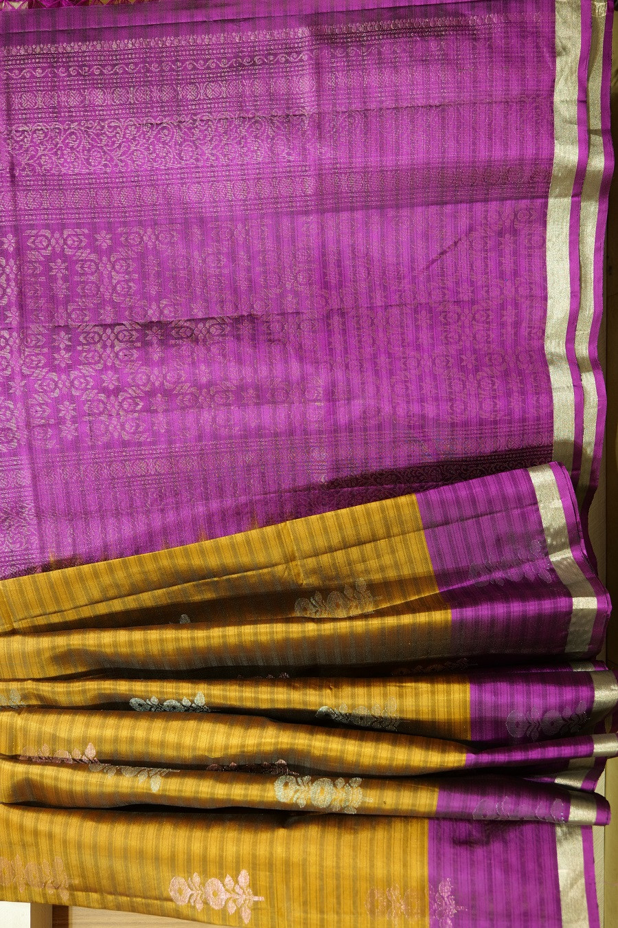 The silk is enhanced with fine self-woven linear textures and delicate floral butis that shimmer gently, lending understated opulence to the drape. The contrast royal purple pallu, adorned with traditional woven motifs, is beautifully framed by a classic zari border-adding a touch of ceremonial grandeur.